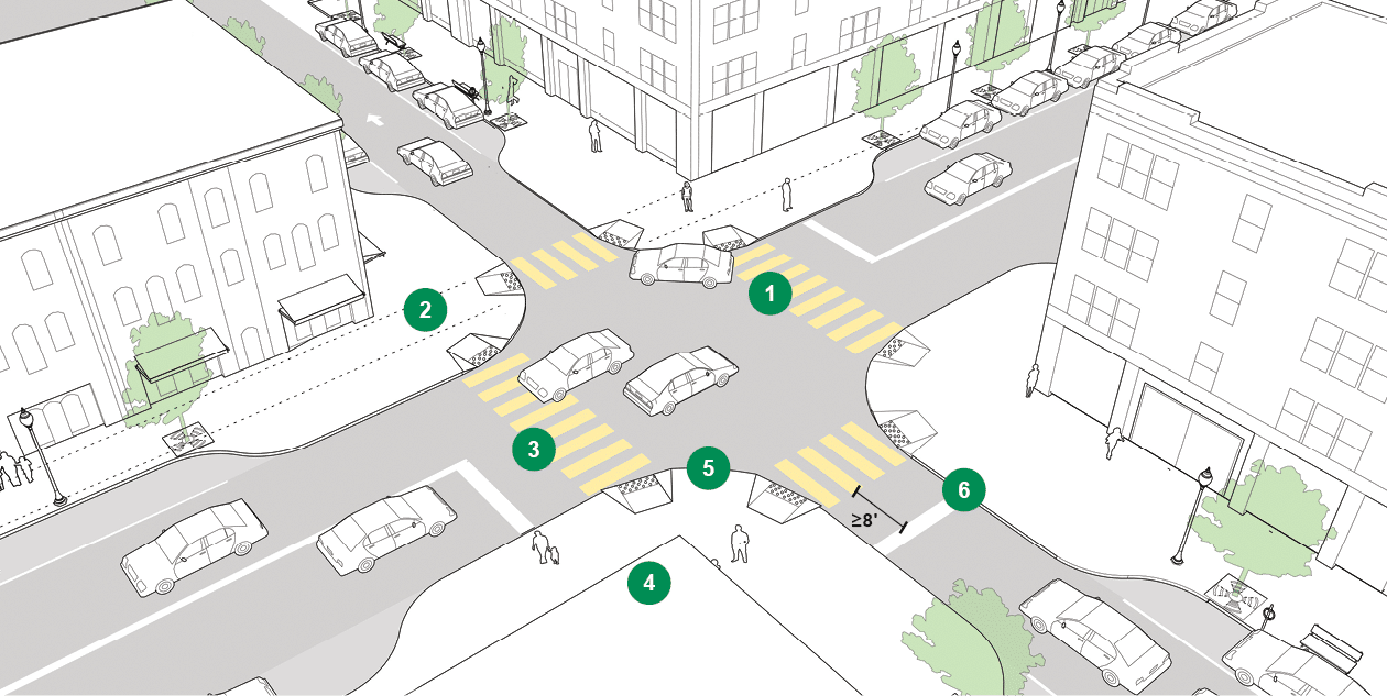 Continental-style crosswalks the city will install at 30 signalized intersections. Image credit: NACTO Urban Street Design Guide