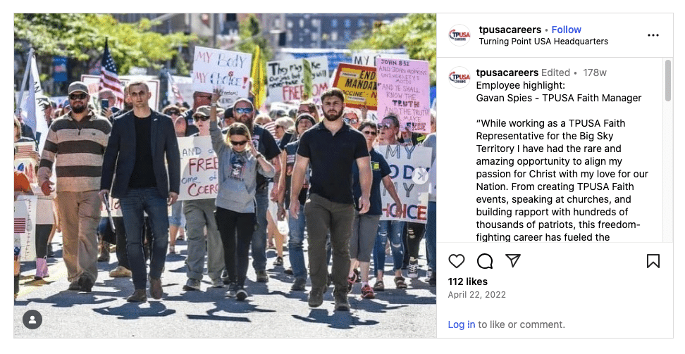 TPUSA allowed Spies to fight COVID mandates — one of Feucht’s, Shea’s and Kirk’s primary personal bugaboos — along with other progressive causes, most prominently queer representation in the public square.