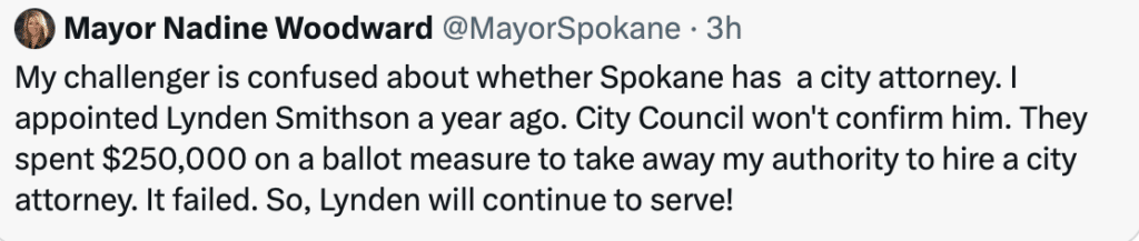 Brown’s tweet is mostly accurate, but there is some nuance. Spokane Municipal Code reads: “persons appointed for the job positions of interim or acting department head shall serve as such for up to 180 days, which period can be extended for up to an additional 180 days by city council resolution.” That 180 days is meant to give the administration time to find a suitable candidate to take over the role permanently. The extension would allow for a longer-than-expected search process. To date, city council has offered no extension — and it appears the administration never asked for one — so Smithson’s legal term as interim city attorney appears to have been over for nearly 6 months.