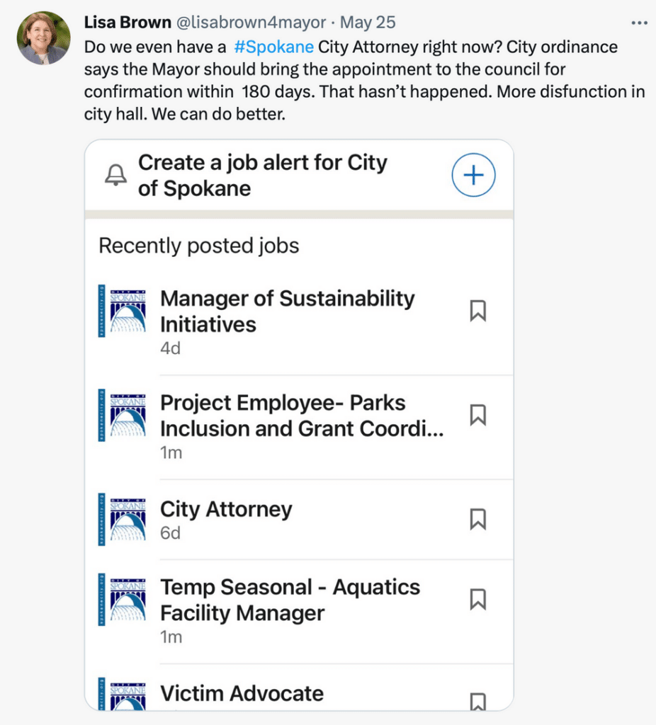 There are a number of ambiguities in the tweet: Is Woodward putting Smithson forward as her chosen candidate for permanent City Attorney? If so, why hasn’t the formal appointment process begun? Were other candidates considered? The City Attorney job post Brown referenced in her Tweet — which appeared on the City’s jobs website and was mirrored on LinkedIn — closed on May 23, 2023, long after Smithson’s 180 days were up.