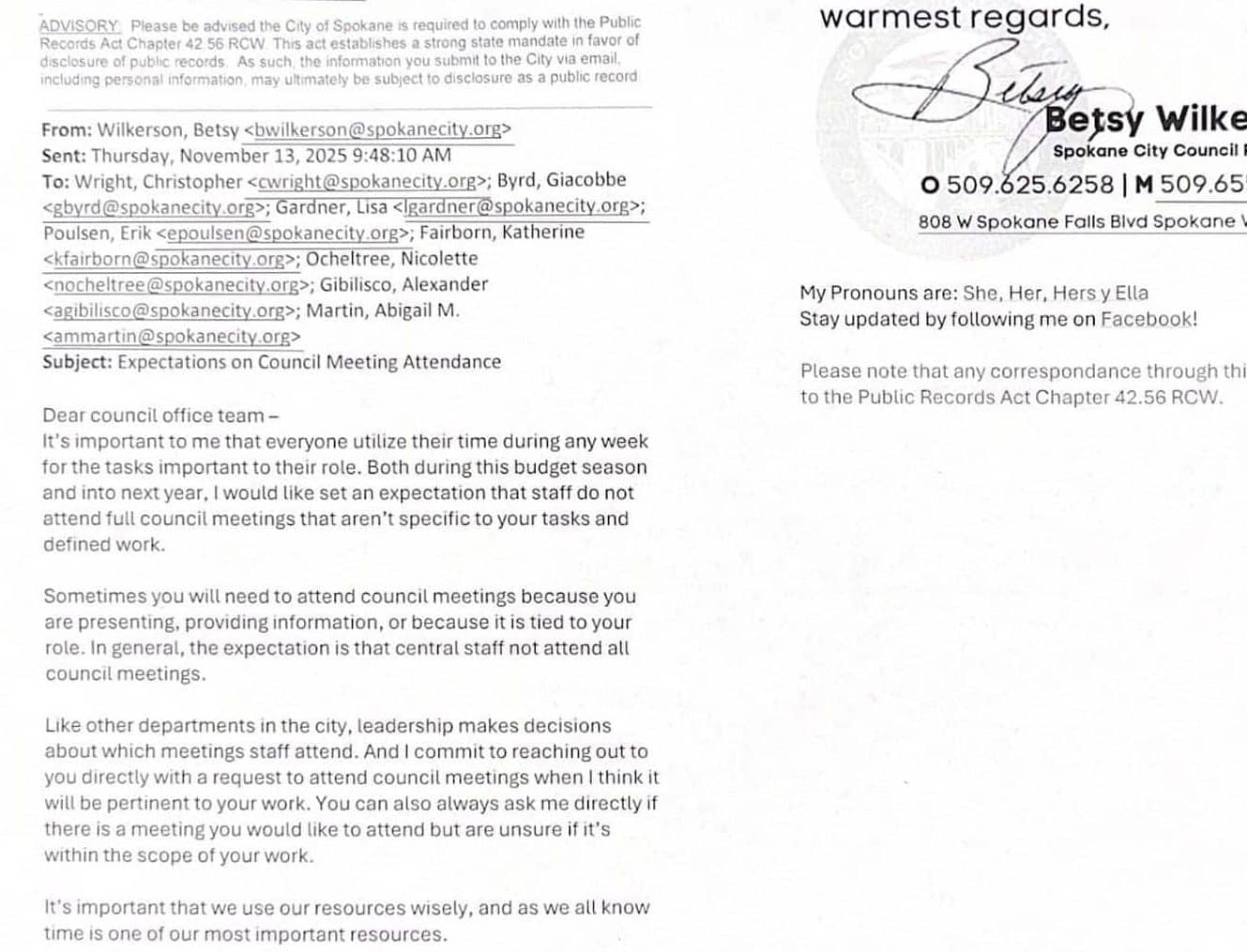 After the meeting on Tuesday, November 11, Wilkerson sent an email to council staff asking them not to use staff time to attend meetings through budget season and beyond, unless they’re explicitly asked to be there.