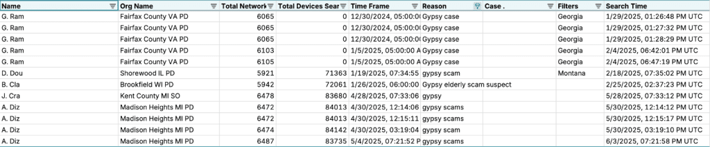 Twelve of those searches appeared on Spokane County’s Flock log too. One of those searches, from a deputy in Michigan, was solely the word “g*psy.”