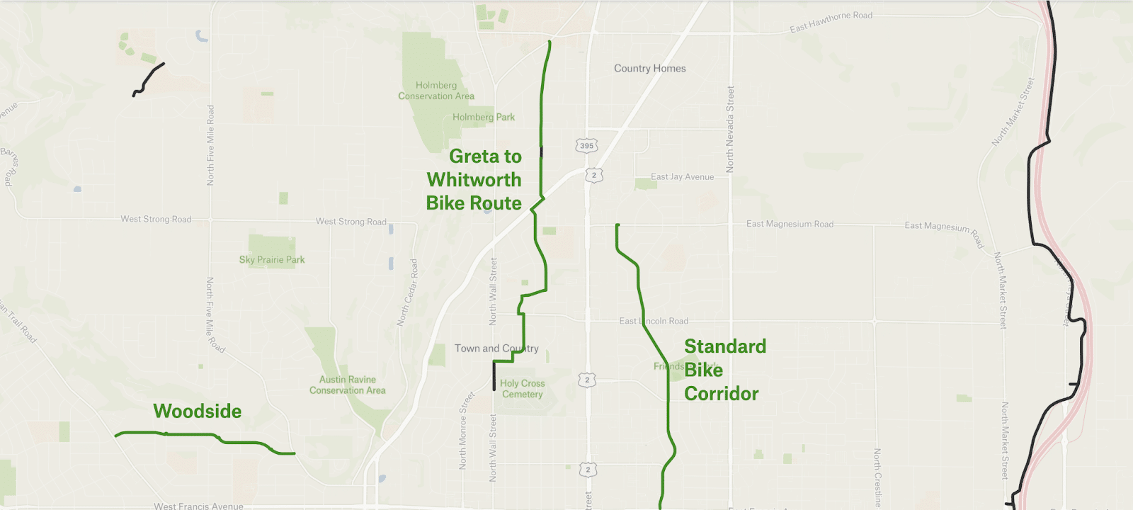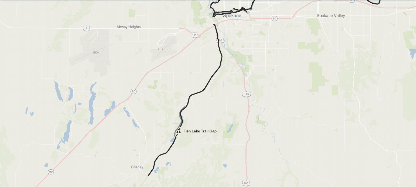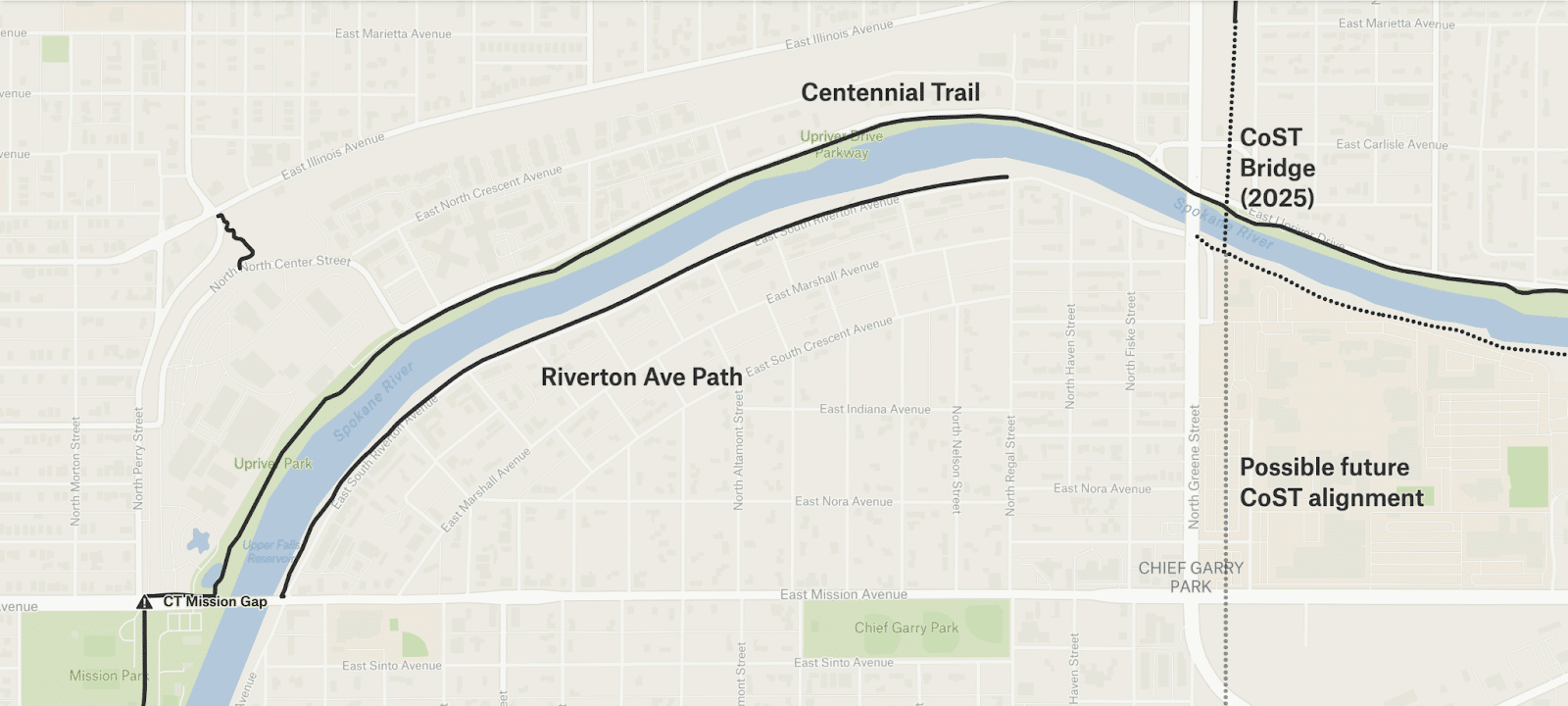 Good news: the city of Spokane has funded a project to bridge the roughly one-mile gap, which consists of a bridge over the train track and paving the remainder. It’s planned for 2028.