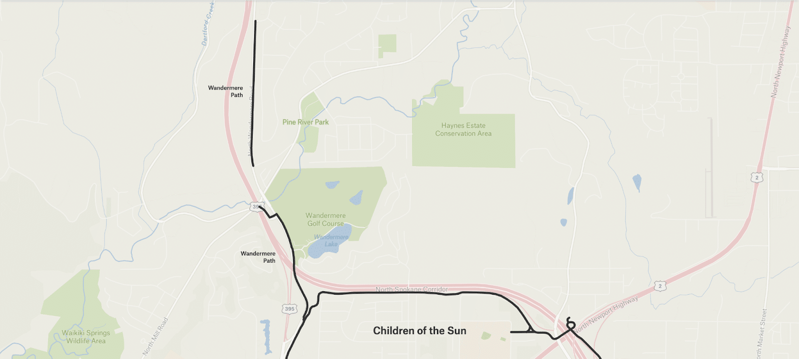 The Children of the Sun Trail (CoST) is a mostly flat, low-stress, off-street path that runs from Wandermere to (nearly) the Spokane River alongside the North Spokane Corridor.