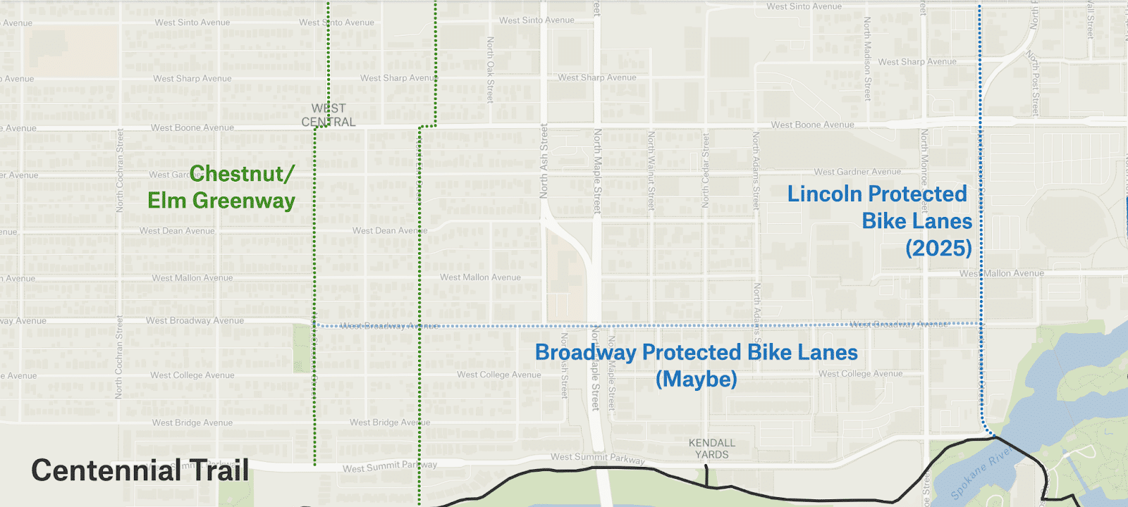- Spokane Falls Boulevard from Division to Post: the 2027-2028 rebuild could include protected bike lanes heading both east and west.