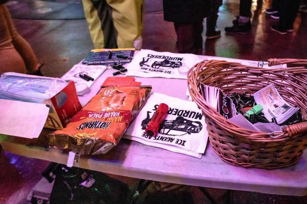 Organizers from Mutual Aid Survival Squad (MASS) and Spokane Community Organized Response Network (SCORN) put up tables with everything from hand warmers, candles, warm drinks to art prints that read “ICE are murderers.”