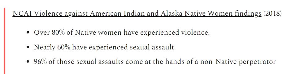 So Indigenous women — and presumably non-binary, Two Spirit, and gender-diverse individuals, frequently misgendered or uncounted in data sets — face higher risks of violence compared to other ethnic groups in the U.S., yet are least likely to receive adequate protection under the law.