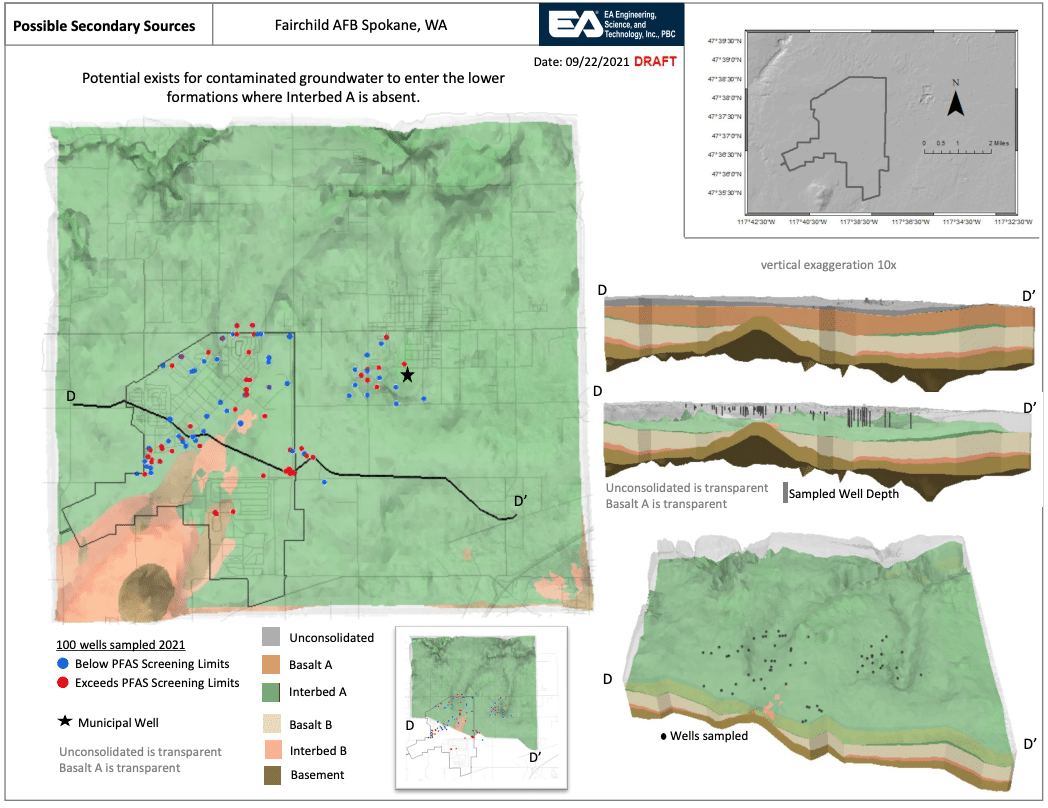 The Air Force offers these resources because, until March, the blame for the PFAS contamination had fallen on Fairchild Air Force Base (FAFB): for decades, the base – like military installations and airports across the country – was required to use a foam material containing PFAS in firefighting drills. The chemicals ran off hard surfaces and seeped into the honeycomb of underground water bodies called aquifers from which the community drew its drinking water.