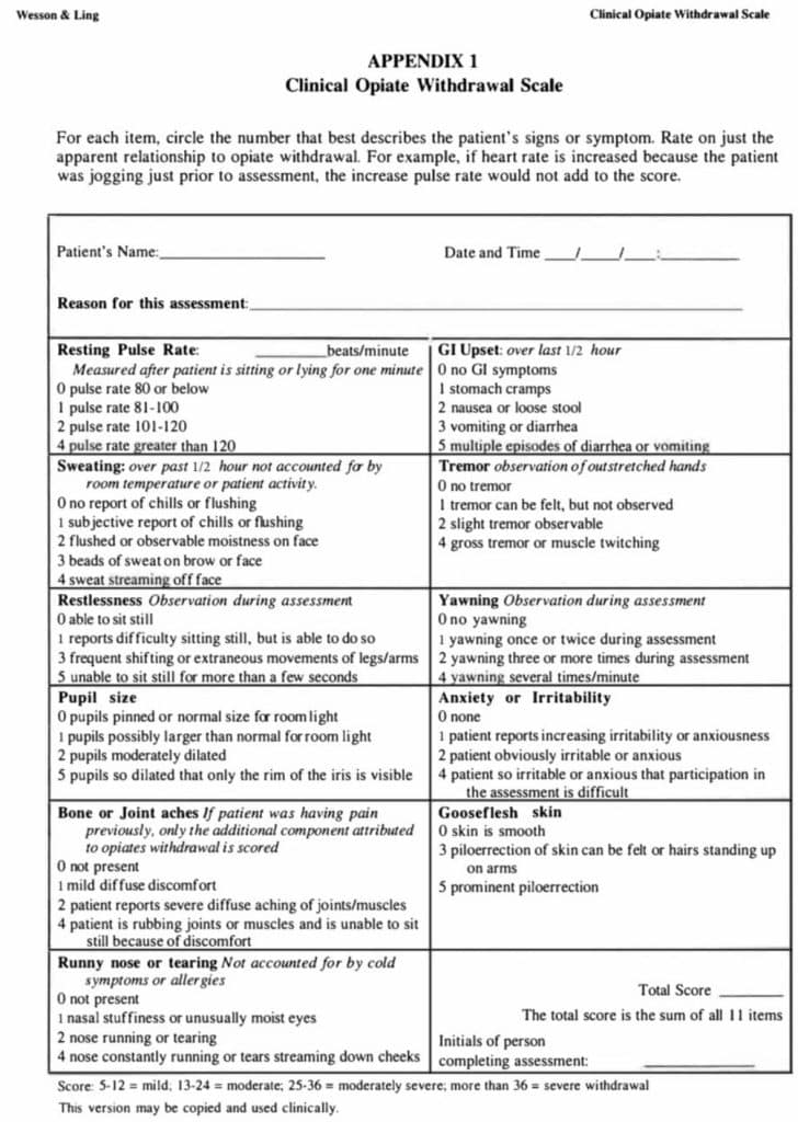Now McEntee, the paramedic, can administer 16 milligrams of the drug on the scene after administering a test called the Clinical Opiate Withdrawal Scale (COWS), which measures the severity of withdrawal symptoms someone is experiencing. COWS measures 11 different withdrawal symptoms on a scale from 1 to 4 or 5 (depending on the symptom). McEntee can give Suboxone to anyone with a total of 7 or above, meaning a person can get treatment if they are experiencing mild withdrawals across about 60% of the symptom criteria, or more severe symptoms across two or three criteria.