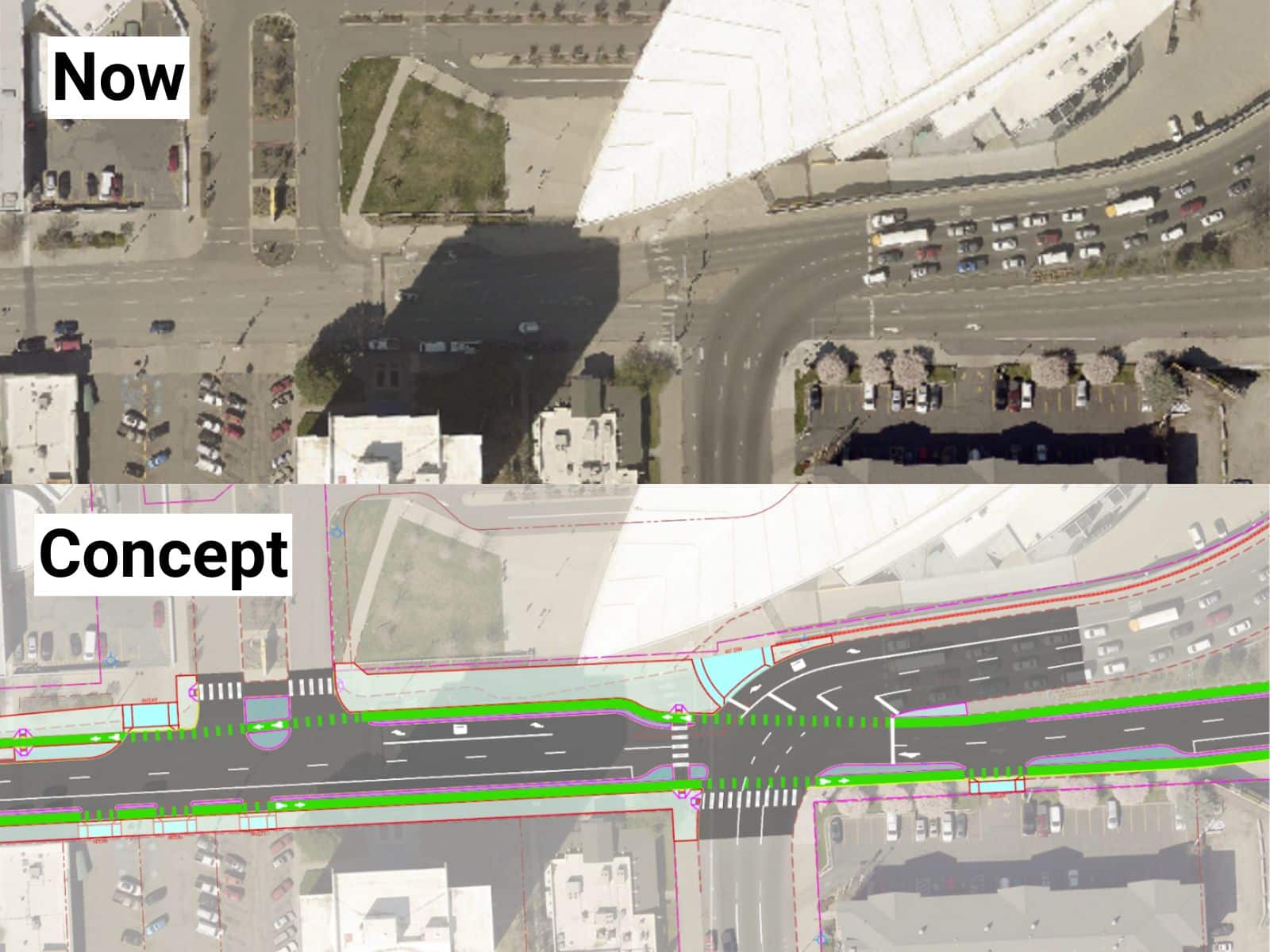 This early concept shows a simplified intersection that removes the awkward merge in front of the convention center — one that is especially unclear and difficult to navigate on a bike.