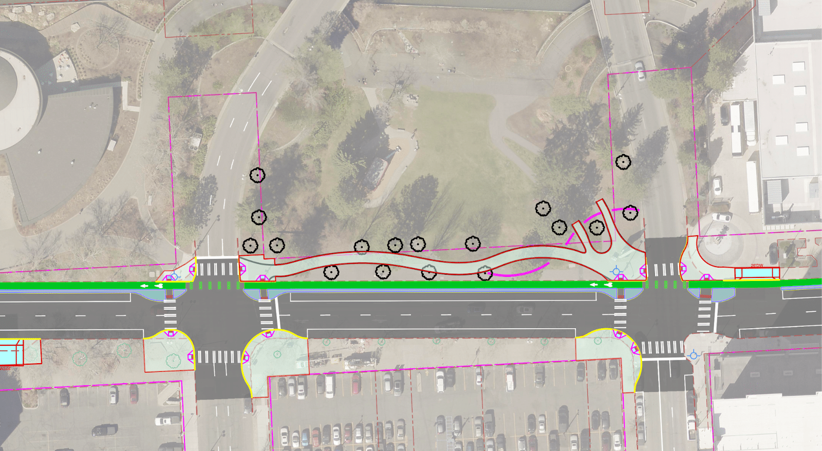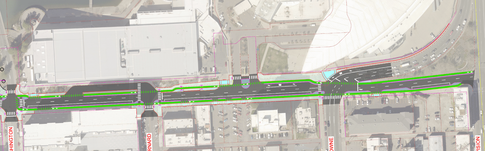 Along that route, there’s a lot of room to get creative. The right-of-way (the land the city owns, street and sidewalk included) along Spokane Falls Boulevard is over 90 feet wide.