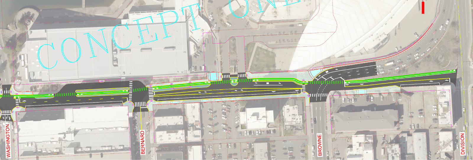Don’t worry folks, some early concepts include additional curb parking spots, so don’t come at me about losing parking. There are also three parking garages (at the mall, at the Convention Center, and at The Grand) and three large surface lots along Spokane Falls Boulevard, so there is plenty of parking in the area**.