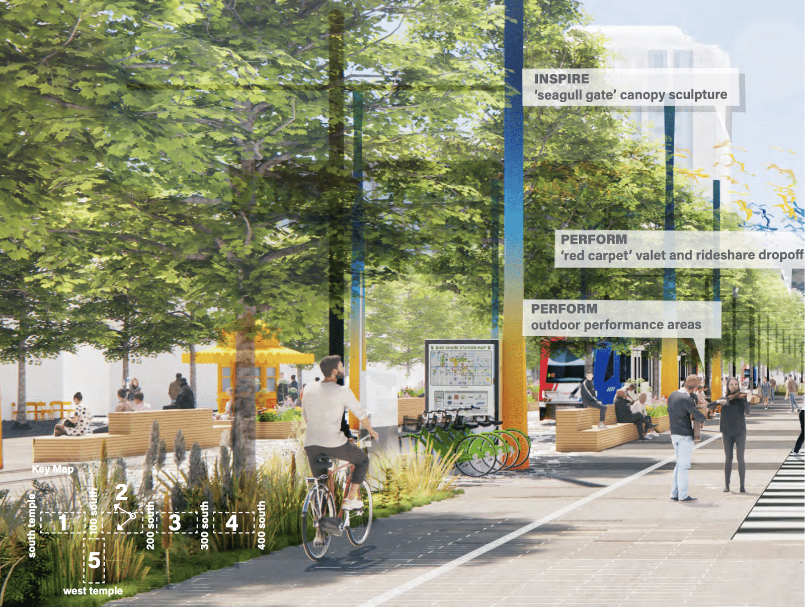 This section of Salt Lake City’s Main Street is similar to Spokane Falls Boulevard: it has aging utility lines and connects popular downtown destinations, including a large modern mall, a religious center, an outdoor concert venue/ice rink, a convention center and two performing arts centers.