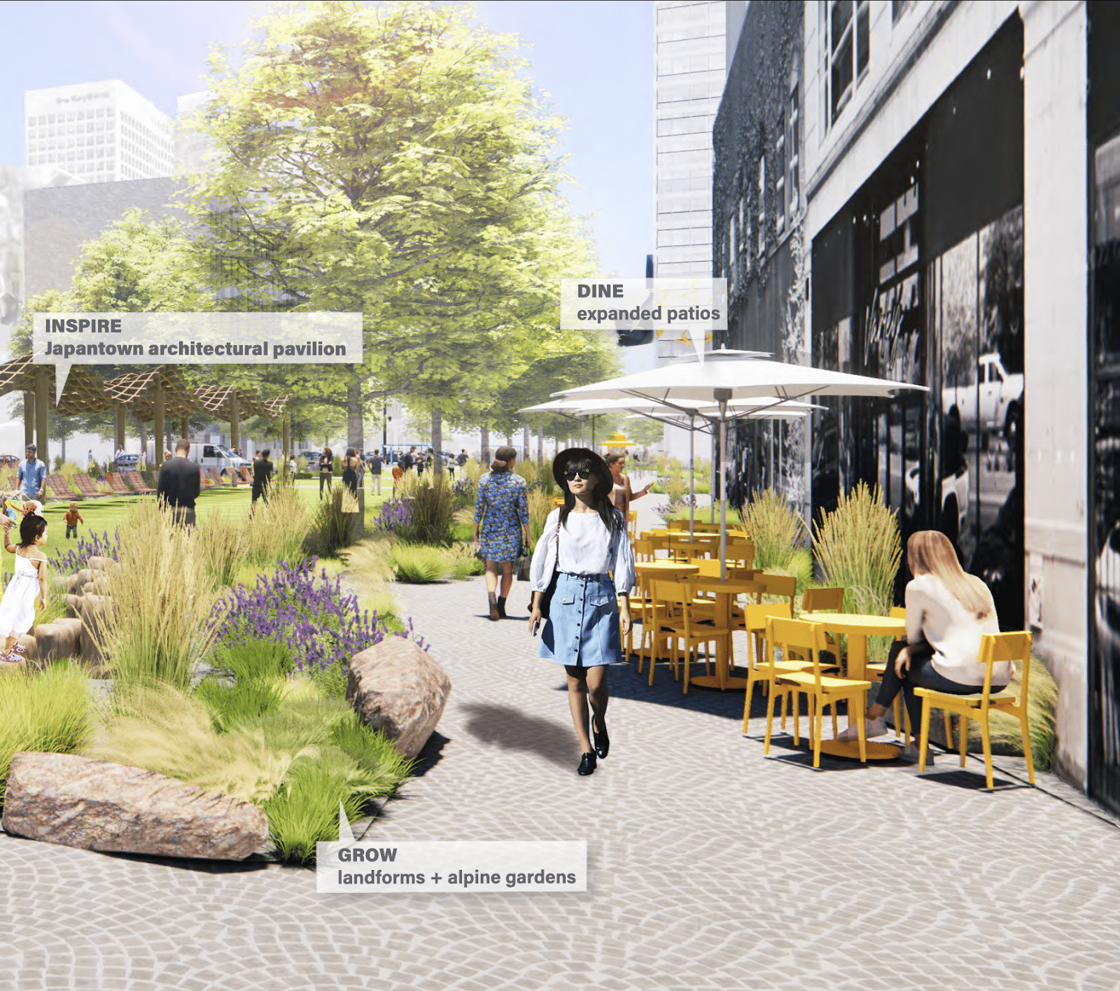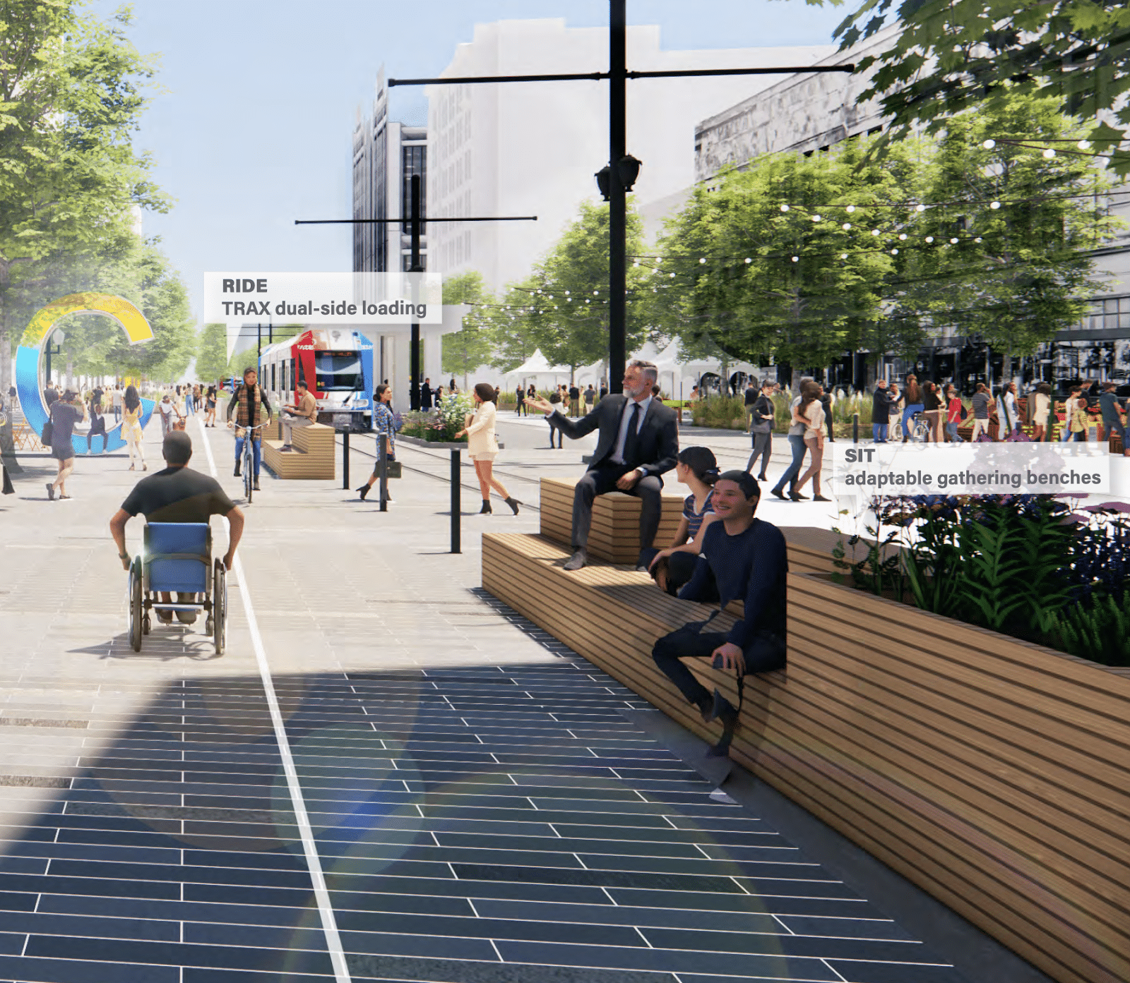 Early concepts show these additions within the right-of-way: restaurant patio seating, immersive public art installations, outdoor lounge and work areas, gardens to gather in, overhead canopy structures, plazas with fireplaces, 285 new trees to cool and shade the area and plentiful space to safely ride and walk. At a vibe level, it feels like a place people will want to gather, not just a place vehicles pass through.