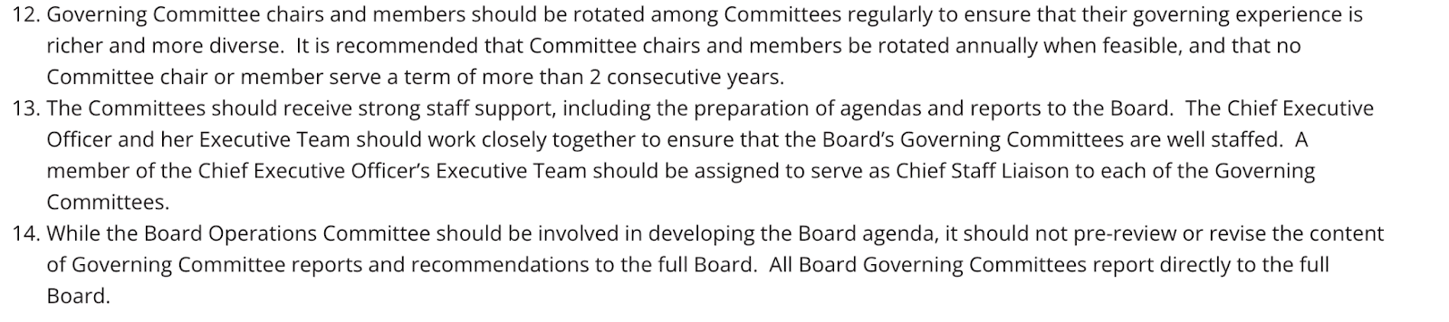 “Governing Committee chairs and members should be rotated among Committees regularly to ensure that their governing experience is richer and more diverse. It is recommended that Committee chairs and members be rotated annually when feasible, and that no Committee chair or member serve a term of more than 2 consecutive years.”