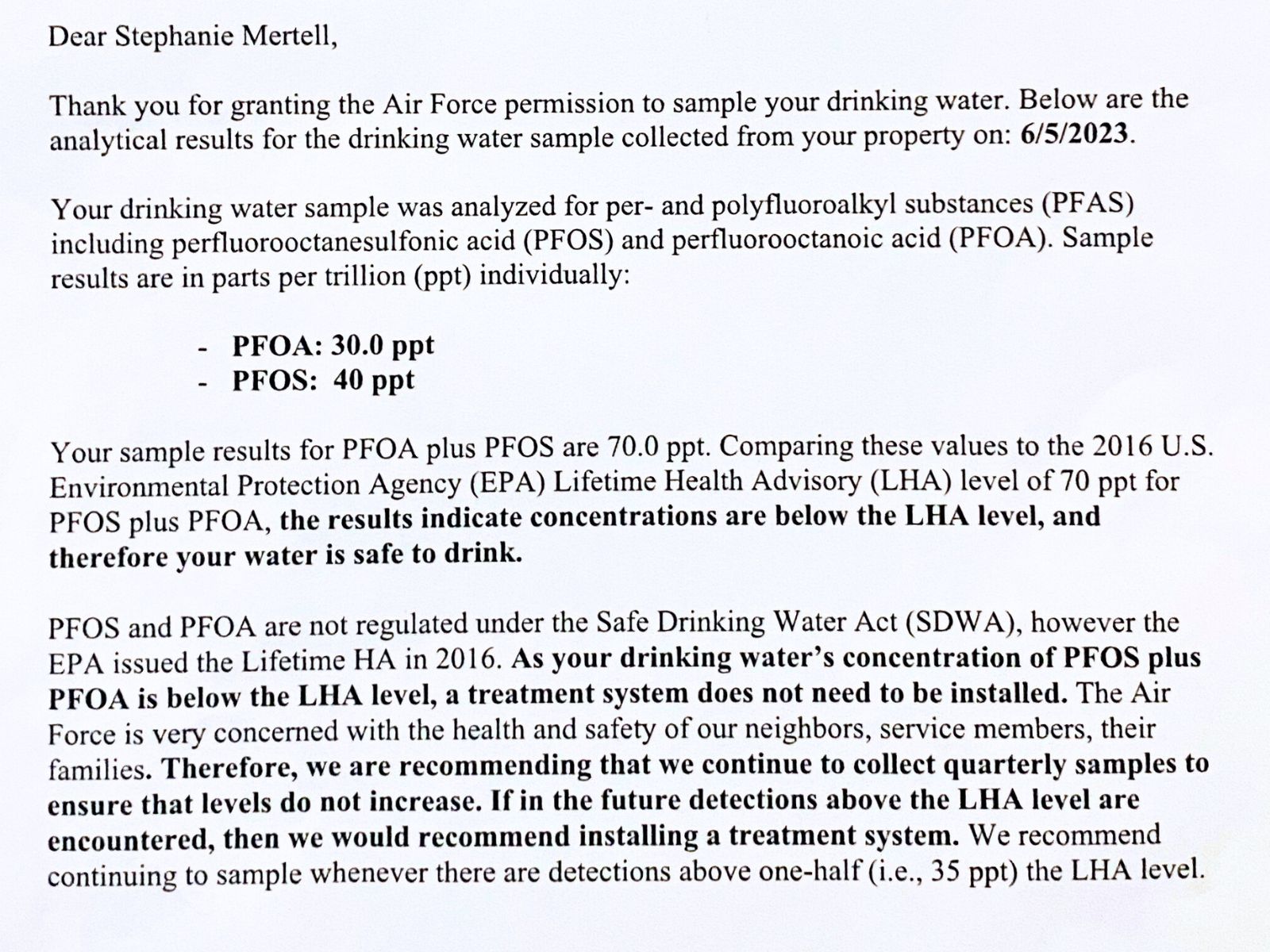 Through 2022, PFAS levels in the Mertells’ well increased. Fairchild sent a letter dated September 30 that recorded a level of 62.2 ppt. Again, they were told, “Your water is safe to drink.” A January 16, 2023 letter recorded 68.5 ppt. Then came another letter, reassuring the Mertells, “Your water is safe to drink.”