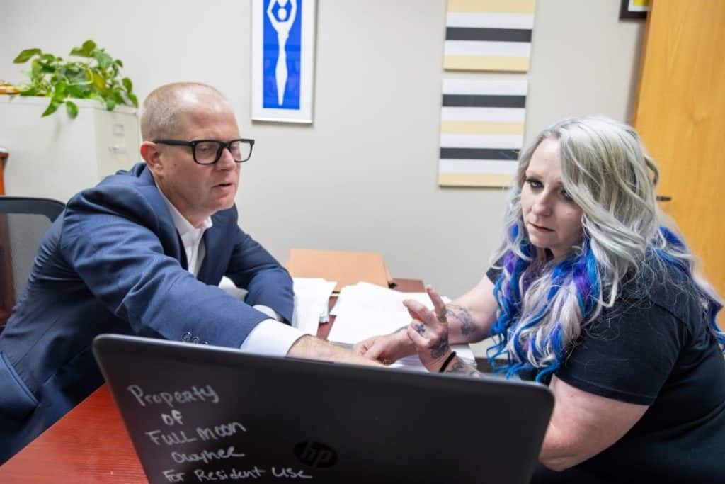 Andrea Weiskircher goes over her case file with her lawyer, Craig Harrison of Ferguson Durham PLLC. (Kyle Green/InvestigateWest)