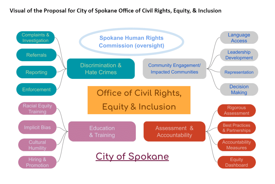 In 2019, The Spokane Human Rights Commission (SHRC), along with a coalition of activists, began hammering out a proposal for an expanded, six-person Office of Civil Rights, Equity, and Inclusion (OCREI). SHRC collaborated with Greater Spokane Progress (GSR) to form a task force that researched and drew up details.