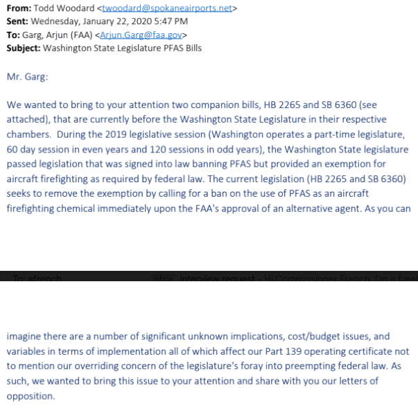 Internal emails obtained by RANGE through a public records request show that in 2020, SIA concentrated its efforts on keeping the state of Washington from regulating the chemicals at airports. Airport officials sent letters threatening legal action to the Legislature, which was considering legislation that would ban PFAS in AFFF at airports, and in 2020 even flew to Washington, D.C., in part to meet with the FAA’s top lawyer about that proposed legislation.