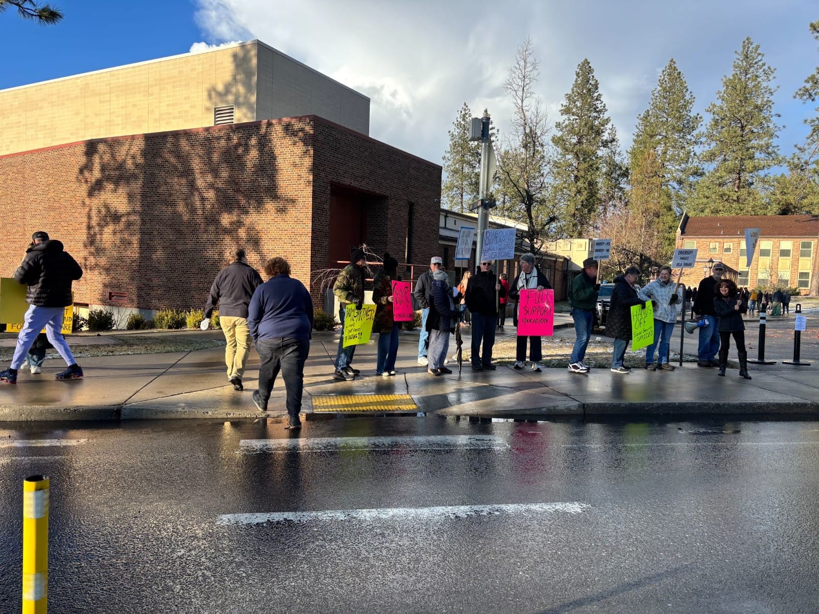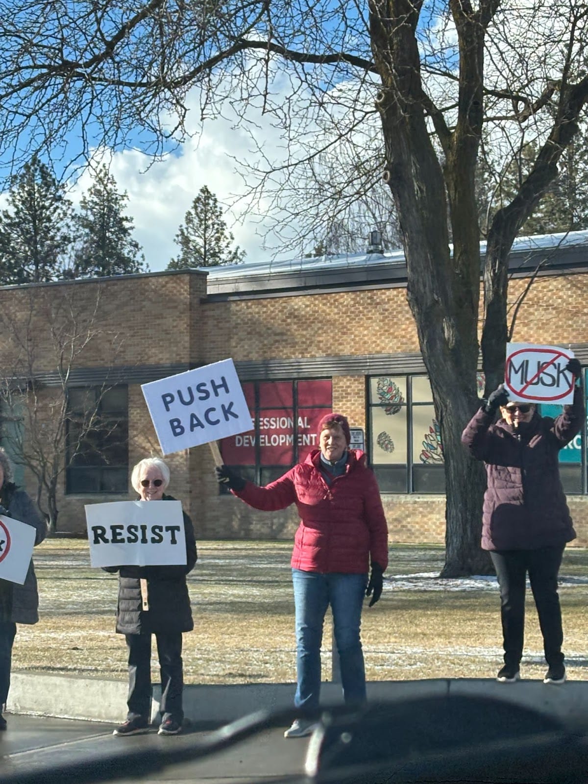 First, for an early indicator of the vibes at the Town Hall: groups of protestors stood at both the street corner nearest to the main road and in front of Whitworth’s Cowles Memorial Auditorium (named for a patriarch of the Cowles family, which owns The Spokesman and KHQ-6) where the event took place. They held signs with slogans like “Resist,” “Hands off Social Security” and “Grow a spine, Baumgartner!”