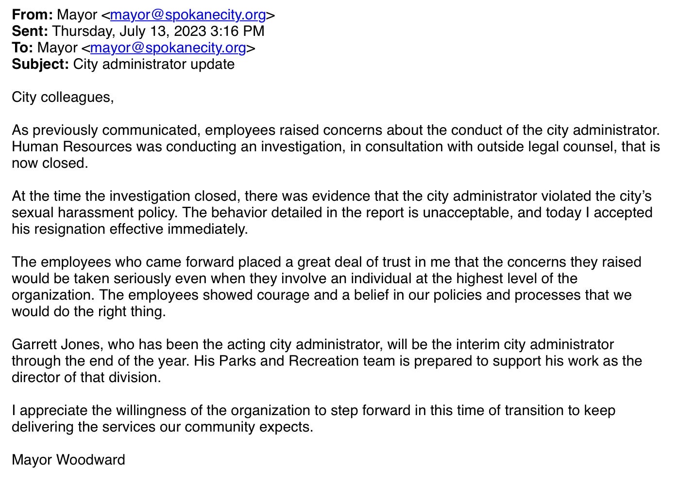 In the brief email, Woodward said the investigation is now closed, and had found “evidence that the city administrator violated the city’s sexual harassment policy.” In the email, Woodward said the behavior was unacceptable and that “I accepted his resignation effective immediately.”