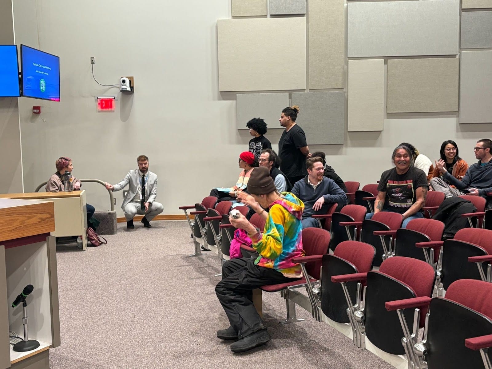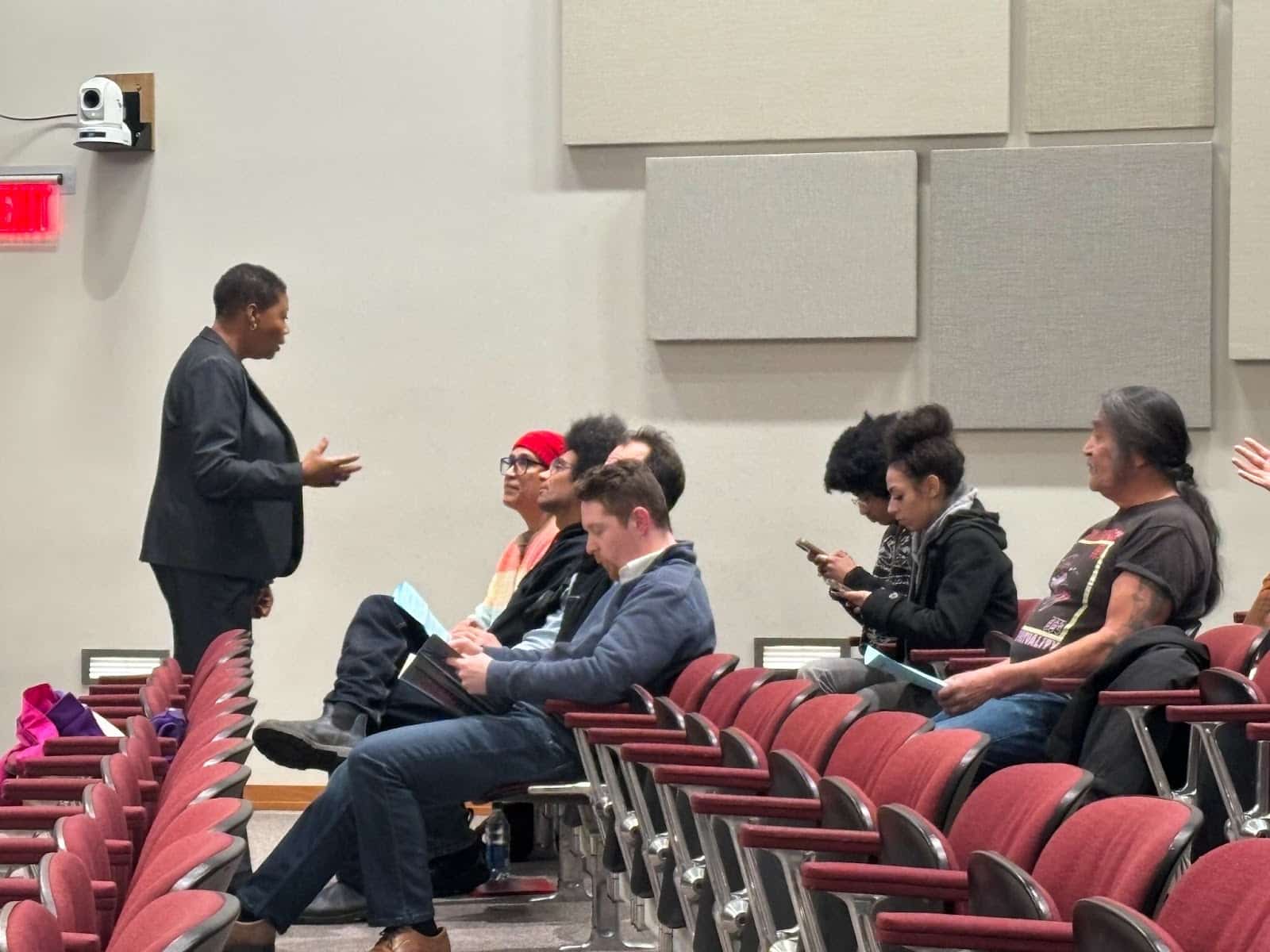 Council President Wilkerson talking with SCAR members during one of the recesses. (Photo by Erin Sellers.)