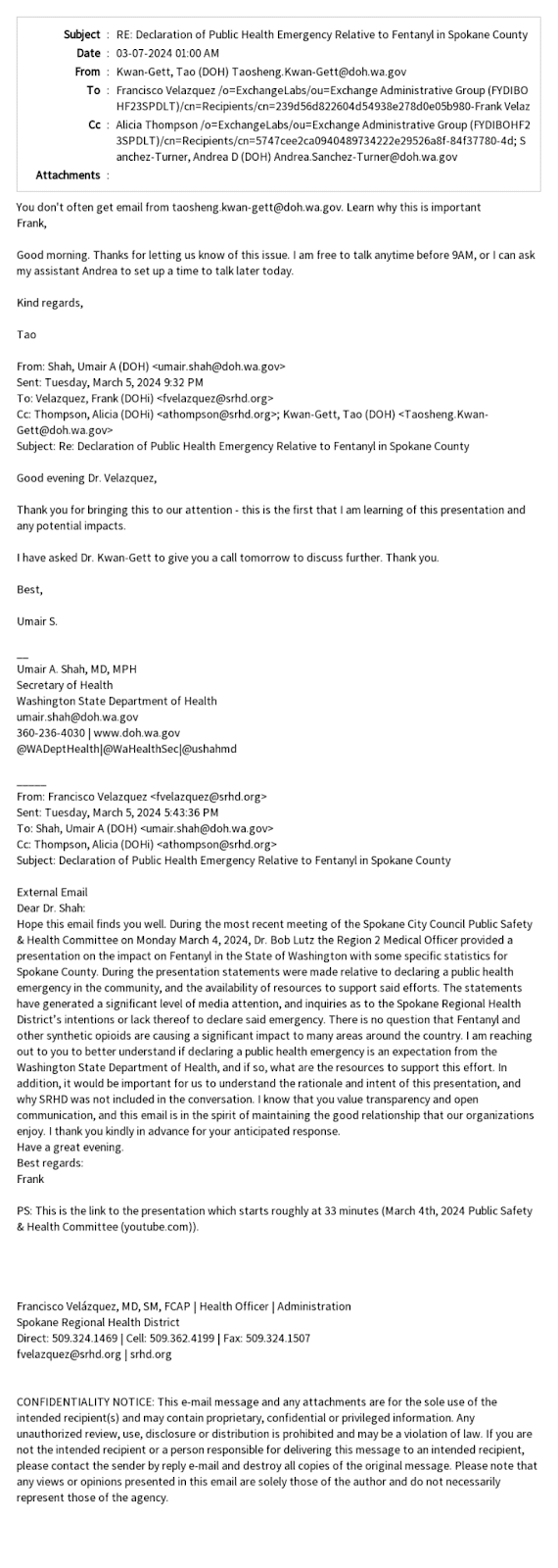 “During the presentation statements were made relative to declaring a public health emergency in the community, and the availability of resources to support said efforts. The statements have generated a significant level of media attention and inquiries as to the Spokane Regional Health District's intentions or lack thereof to declare said emergency,” Velazquez wrote on March 5.