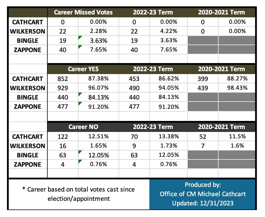 (Infographic created and posted by CM Cathcart, showing a calculation of veteran council member voting records from 2020-2023.)