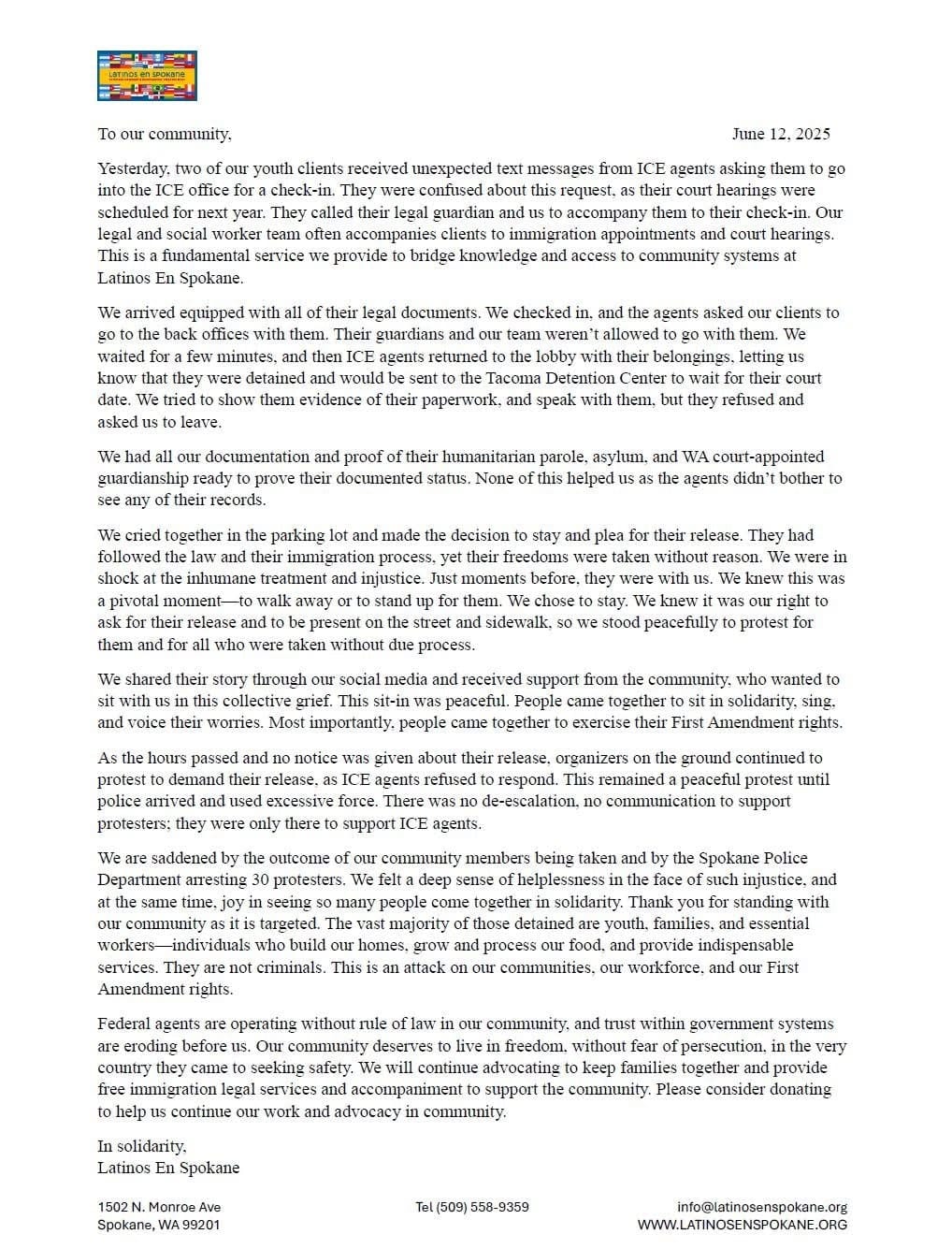 As an advocate and organizer, I know what it means to stand up against injustice. Back in 2018, I stood alongside WAISN to demand that Customs and Border Patrol be barred from Spokane’s Intermodal Station and we won that fight. So when the community was asked to stand up to ICE again on June 11, I didn’t hesitate to answer that call. The young people we tried to protect were following the rules, but ICE unjustly detained them anyway, breaking with their own proper procedure. I’m saddened by the escalation at the hands of law enforcement and that so many of my friends and community members were arrested for expressing their first amendment right to protest.