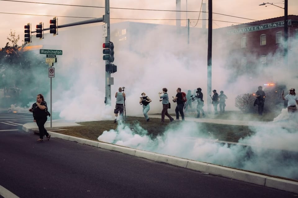 One protestor, who was later arrested, kicked a smoke bomb back towards officers (which was the lone act of violence against officers that we witnessed in the entire evening.) Smoke bombs were thrown in the direction of media members who were corralled into a small area with no clear, safe exit.