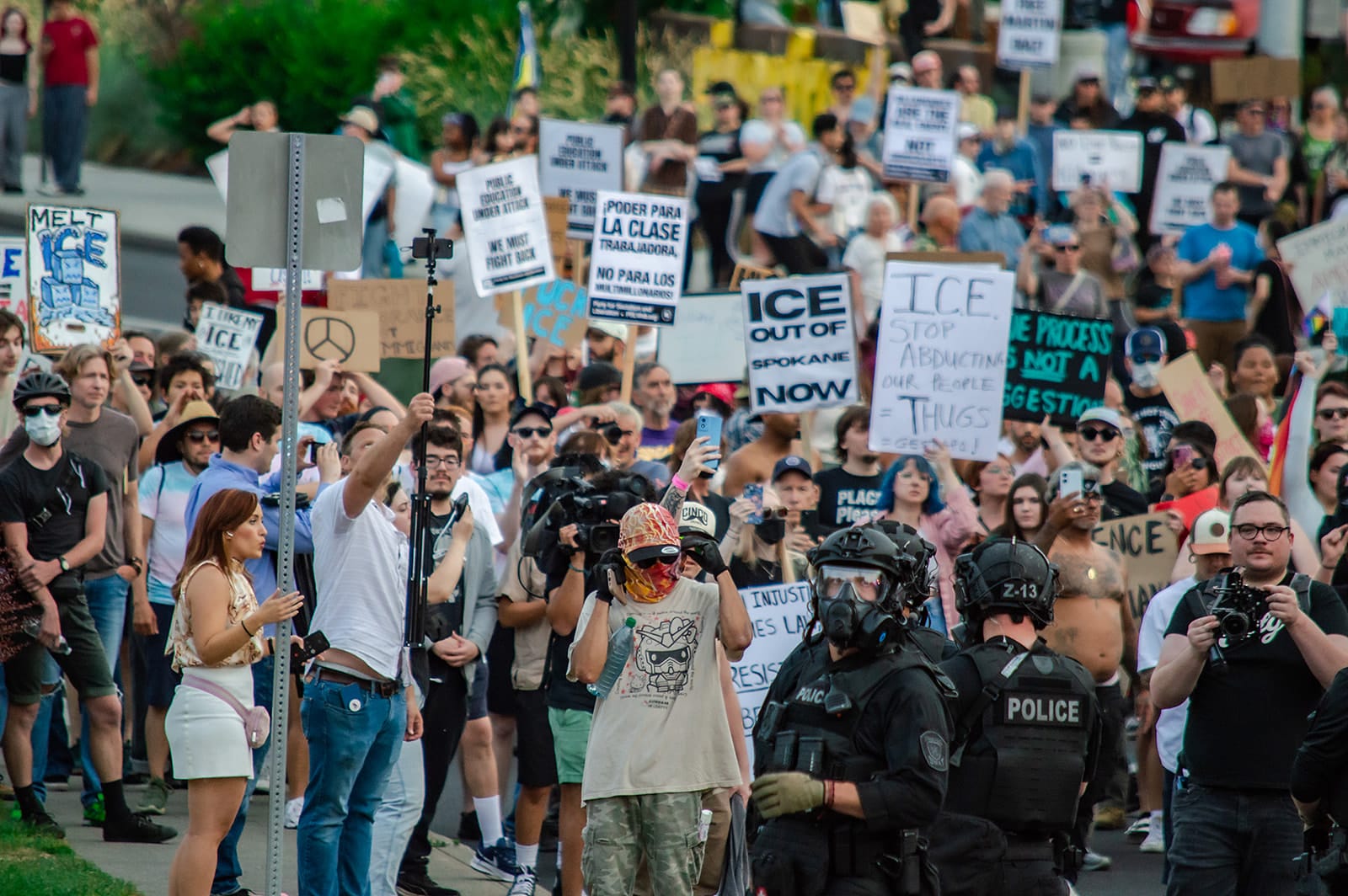 "We condemn the actions by law enforcement at Wednesday’s protest of unjust immigration enforcement policies in Spokane. Whether it was smoke grenades, pepper balls, or other so called “less-lethal” weapons, the effect is the same: these tactics escalate conflict, chill free speech, and inflict real harm. Protesters have a clear constitutional right to gather and publicly criticize government action. The use of chemical agents, impact munitions, and aggressive tactics against largely peaceful protestors is not only dangerous, it undermines public trust and suppresses dissent. Police should be protecting rights, not relying on force or inciting fear and chaos. We stand in solidarity with protesters and asylum seekers who are advocating for fair treatment, dignity, and safety. We call for full transparency from Spokane officials, including the release of bodycam footage, use-of-force reports and any other reviews of police misconduct at the protest.”