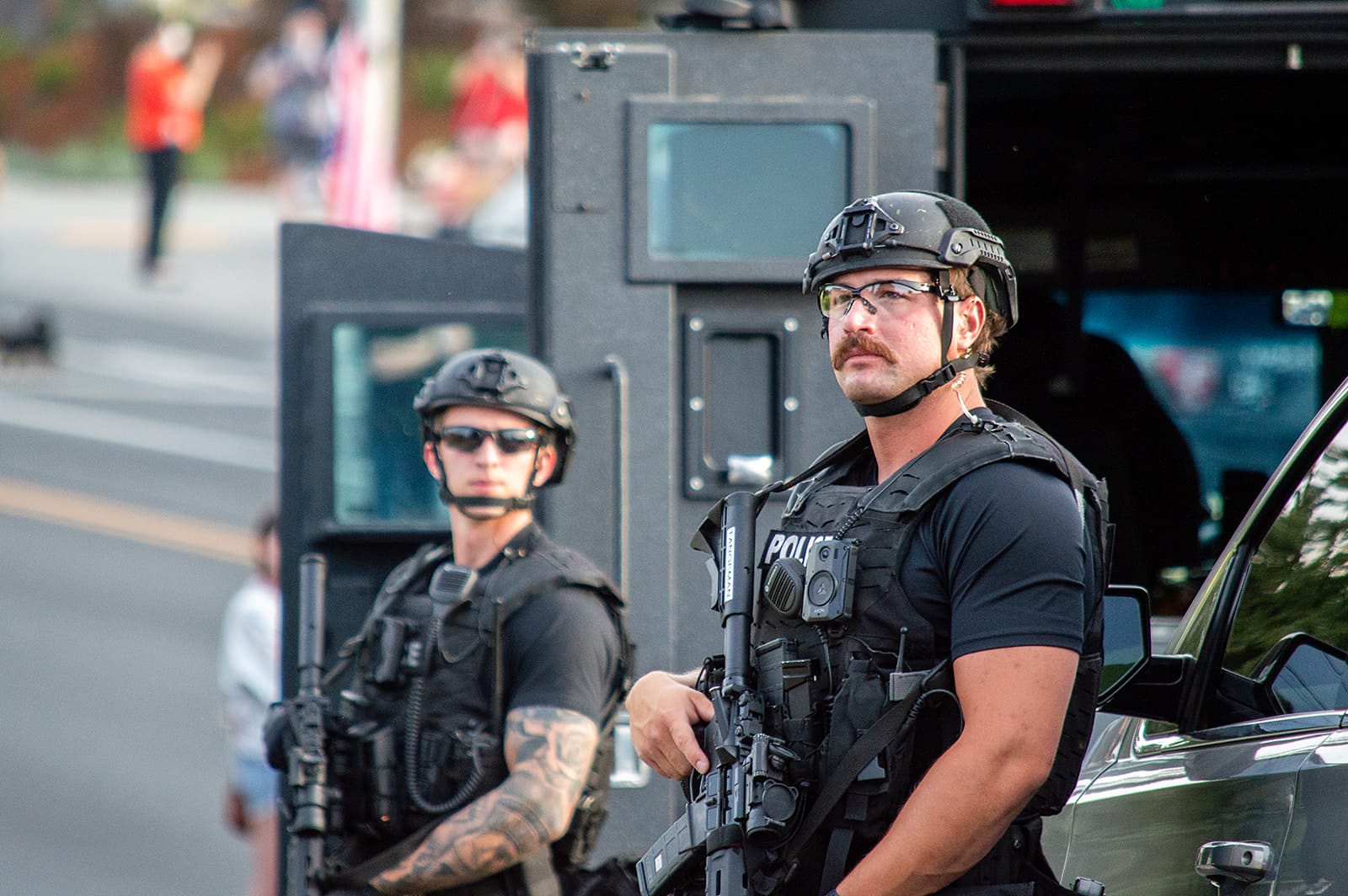 Over the course of the evening, tactical equipment and officers from other jurisdictions arrived on scene, like surveillance drones, a helicopter and additional Bearcats — heavily armored vehicles. We got an anonymous tip that Spokane County Sheriff John Nowels tried to call in the National Guard for what was a nonviolent protest (at least on the part of the protestors) until police arrived. Nowels later told another outlet the Department of Homeland Security had called him rather than SPD.