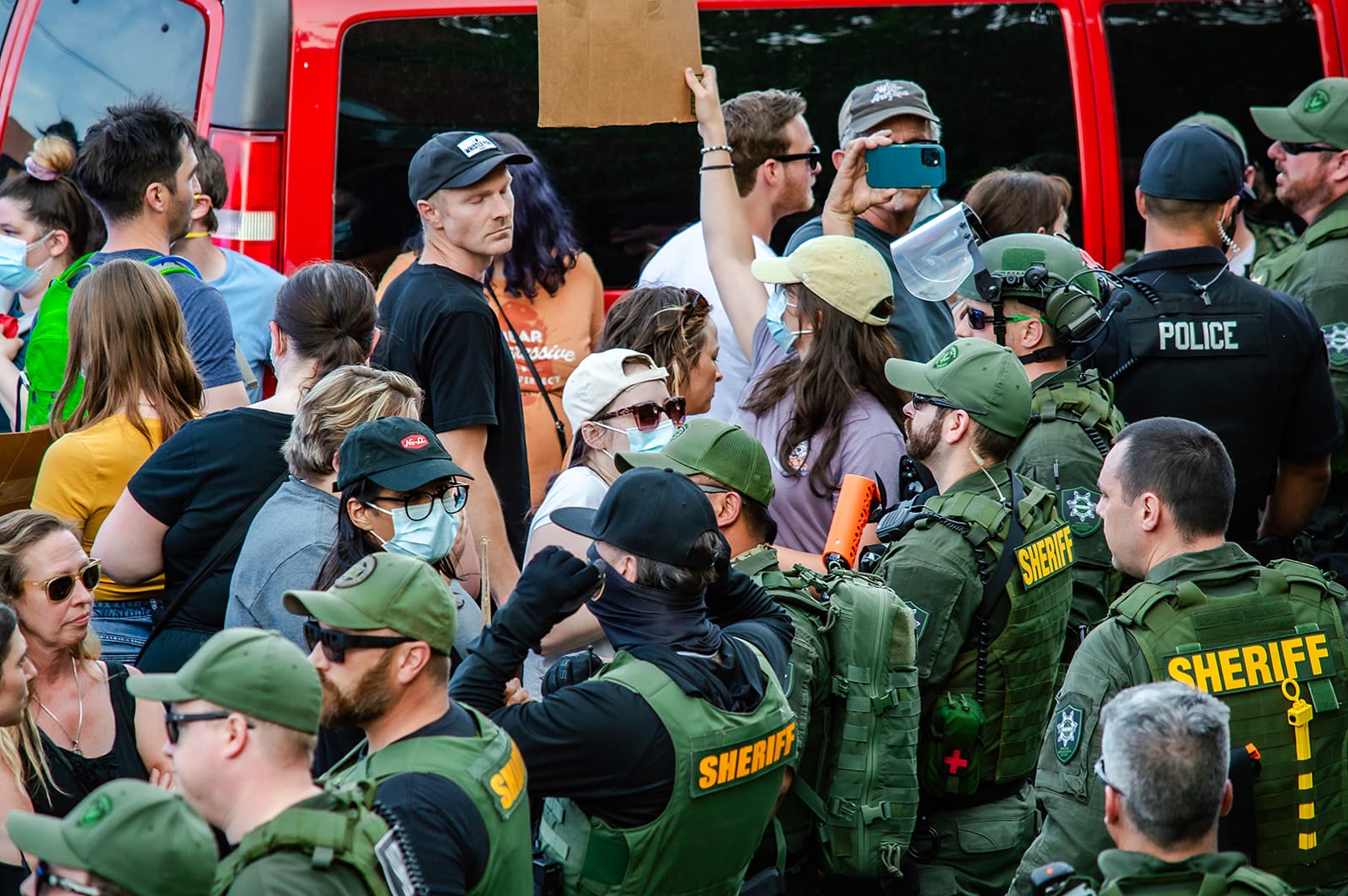 6:26 pm: Protestors then started to coalesce near the police presence, gathering around the red ICE van, including a group that was willing to risk arrest.
