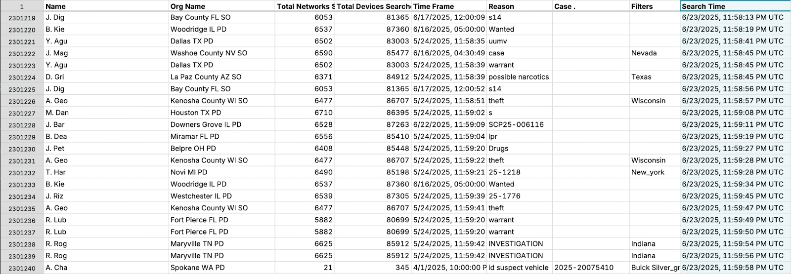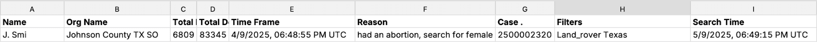 In RANGE’s review of the “reason” and “case” number fields of the provided search data, we found over 289,000 searches with no case number at all and, under reason, some variation of the word “investigation.”