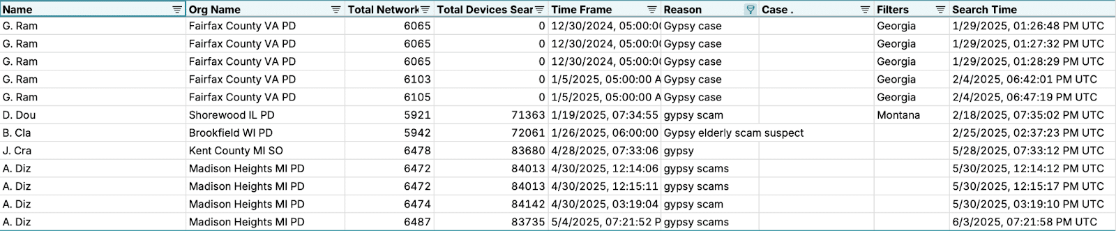 - “Operation Pimp Juice,” and “pimp+juice,” searched by officers in Tennessee, who gave no corresponding case numbers. These could be related to a joint human trafficking operation between Immigrations and Customs Enforcement (ICE) and Tennessee law enforcement, as an archived press release from Immigrations and Customs Enforcement (ICE) and news coverage from the region come up when you Google search for Operation Pimp Juice.