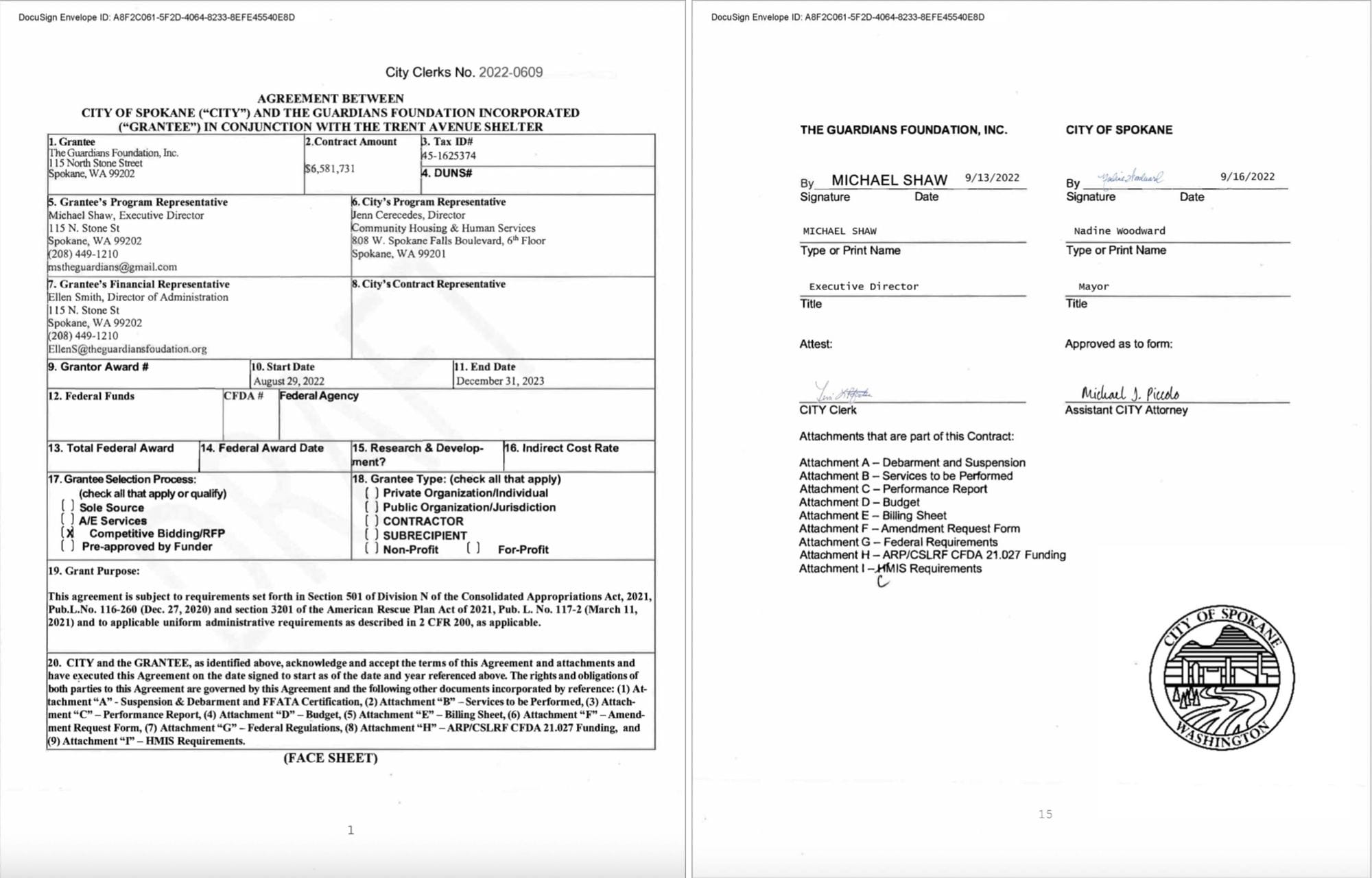 Despite that admission, the confessor, Mary Ellen Smith (who also goes by Ellen Smith), was still listed as the Guardian’s “Financial Representative” on the $6.5 million dollar Spokane city contract to operate the new Trent shelter. That contract was signed by Guardians’ CEO Mike Shaw on September 13 — over a month after the confession was signed.