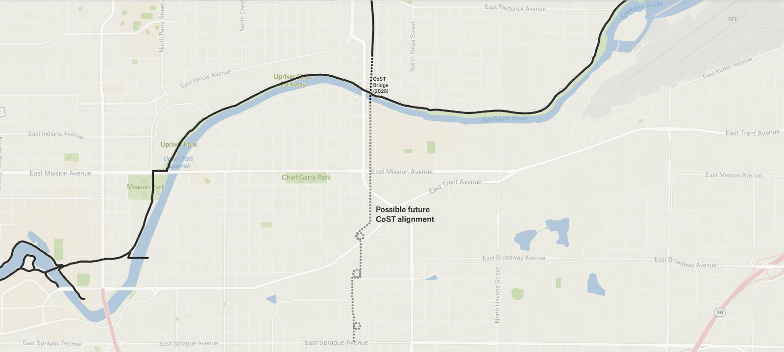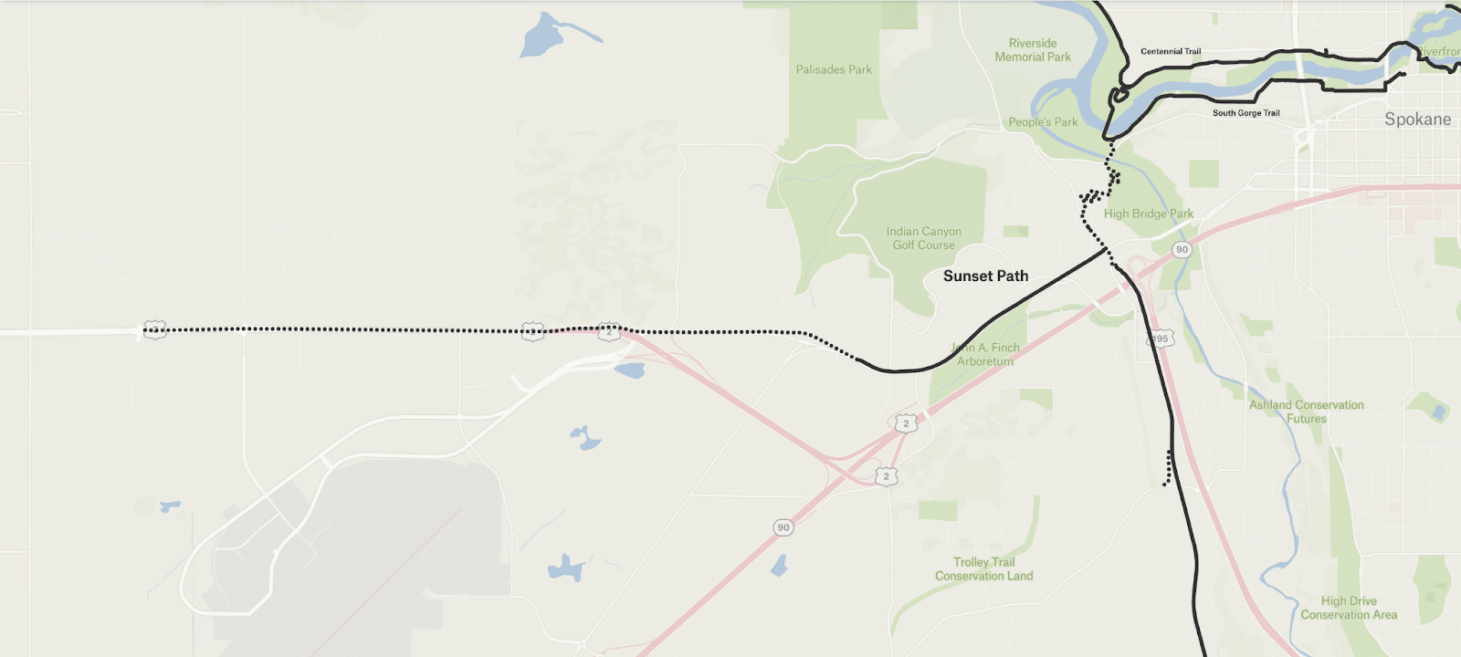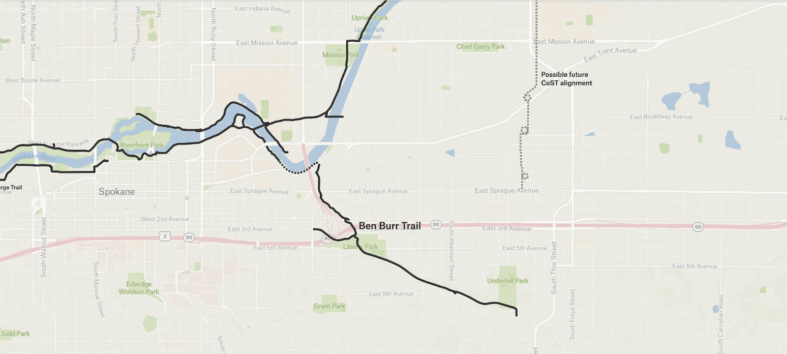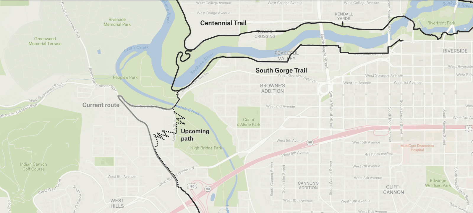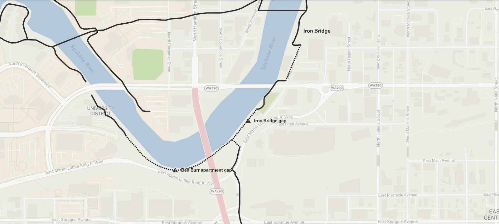 Good news: the city of Spokane has funded a project to bridge the roughly one-mile gap, which consists of a bridge over the train track and paving the remainder. It’s planned for 2028.