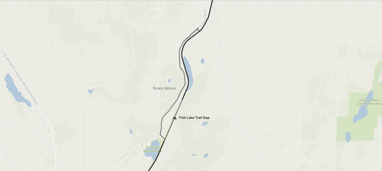 Unfortunately, there is a gap about 10 miles south of Spokane, where the trail is unfinished due to an existing rail line. To continue, one is forced onto Cheney-Spokane Road for a mile-long detour that can get pretty harrowing due to the soft shoulder and traffic speeds on the busy rural route. This gap takes the otherwise very in-law-friendly trail down to a 3.
