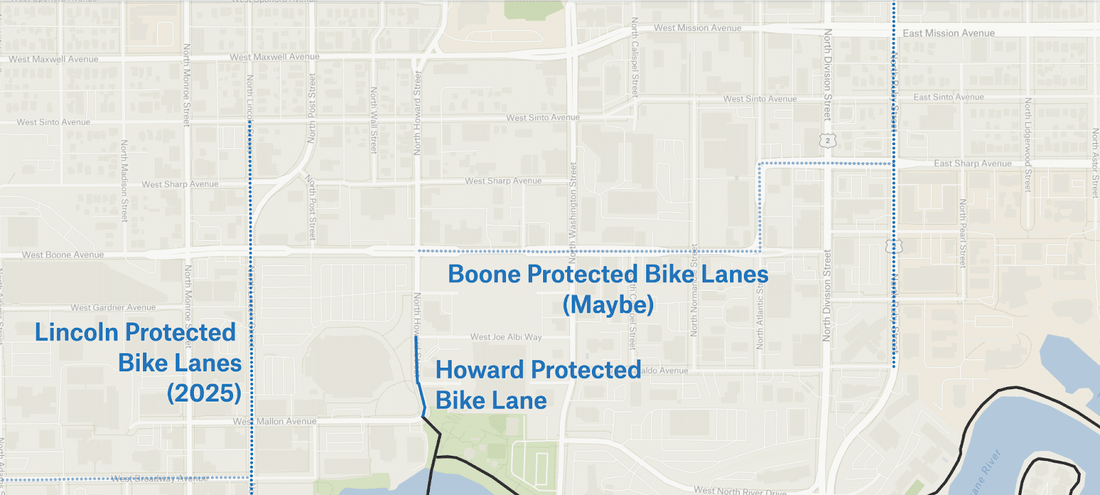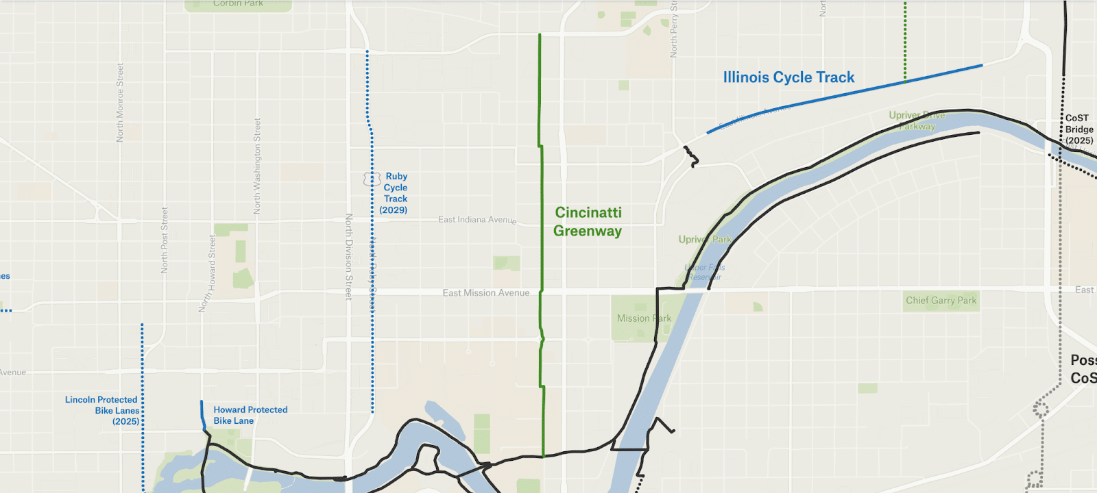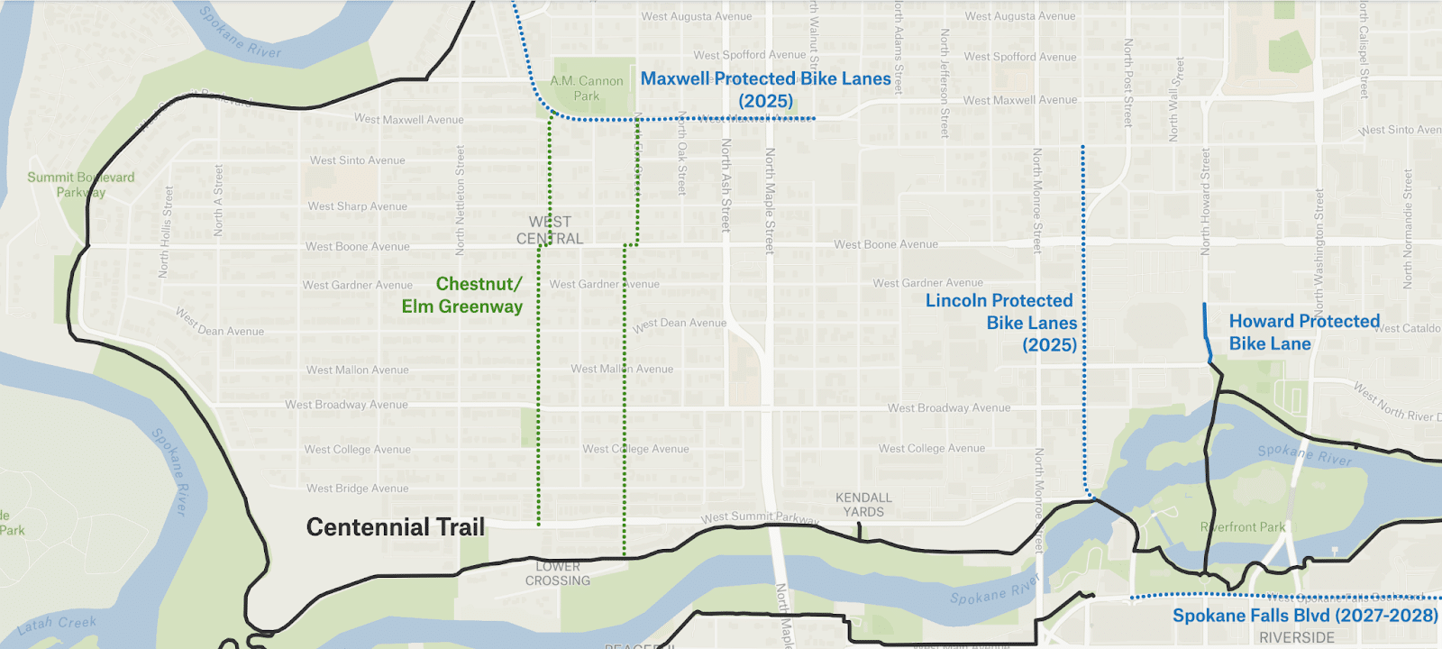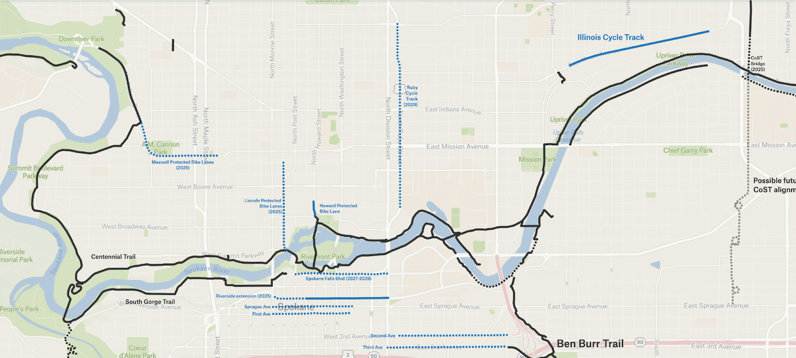 - Spokane Falls Boulevard from Division to Post: the 2027-2028 rebuild could include protected bike lanes heading both east and west.
