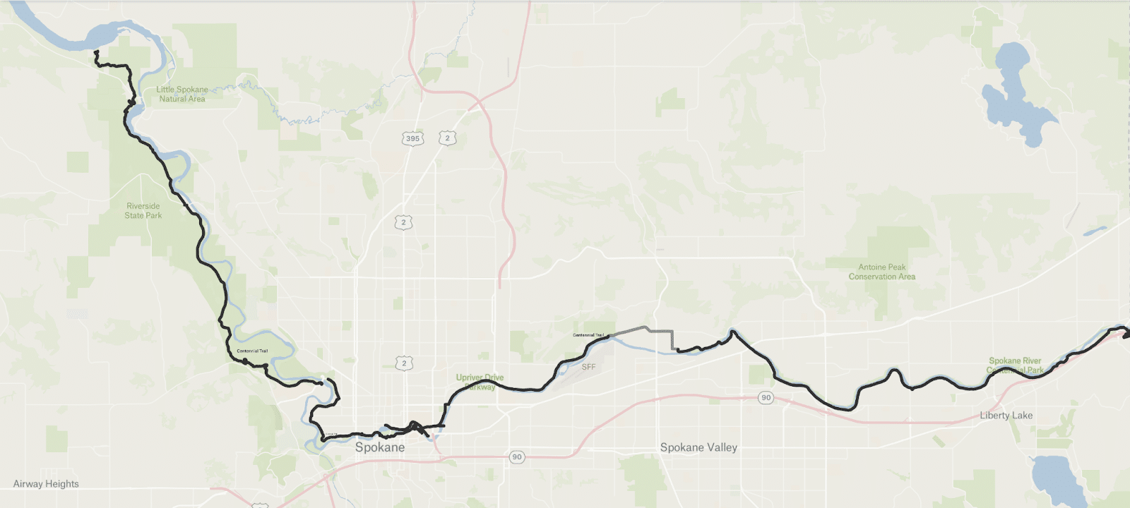 The Centennial Trail (CT) is a mostly off-street paved path from Nine Mile Falls, through Spokane and east to Coeur D’Alene that is used widely for both recreation and transportation. Most of its sixty-four miles are in-law-friendly, with a couple notable exceptions.