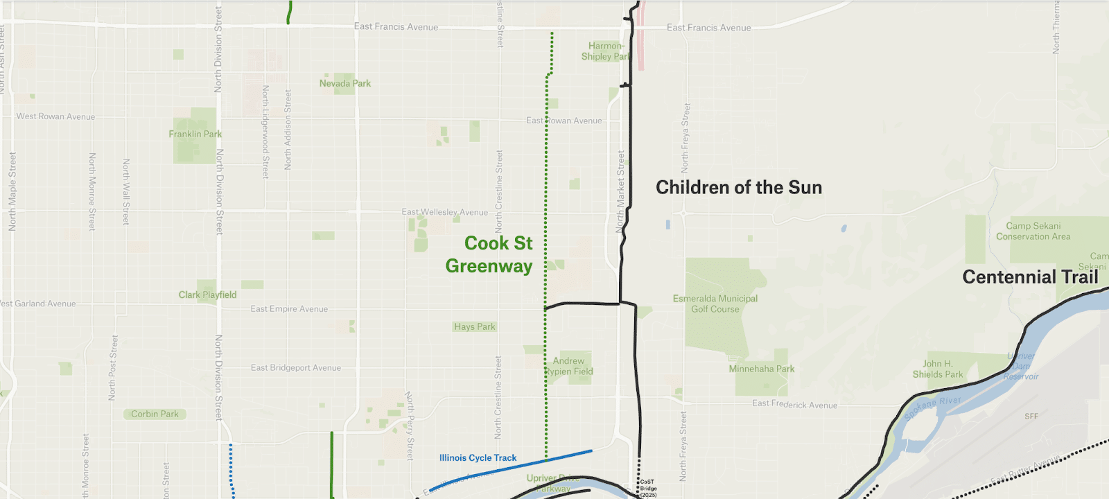 The Children of the Sun Trail (CoST) is a mostly flat, low-stress, off-street path that runs from Wandermere to (nearly) the Spokane River alongside the North Spokane Corridor.