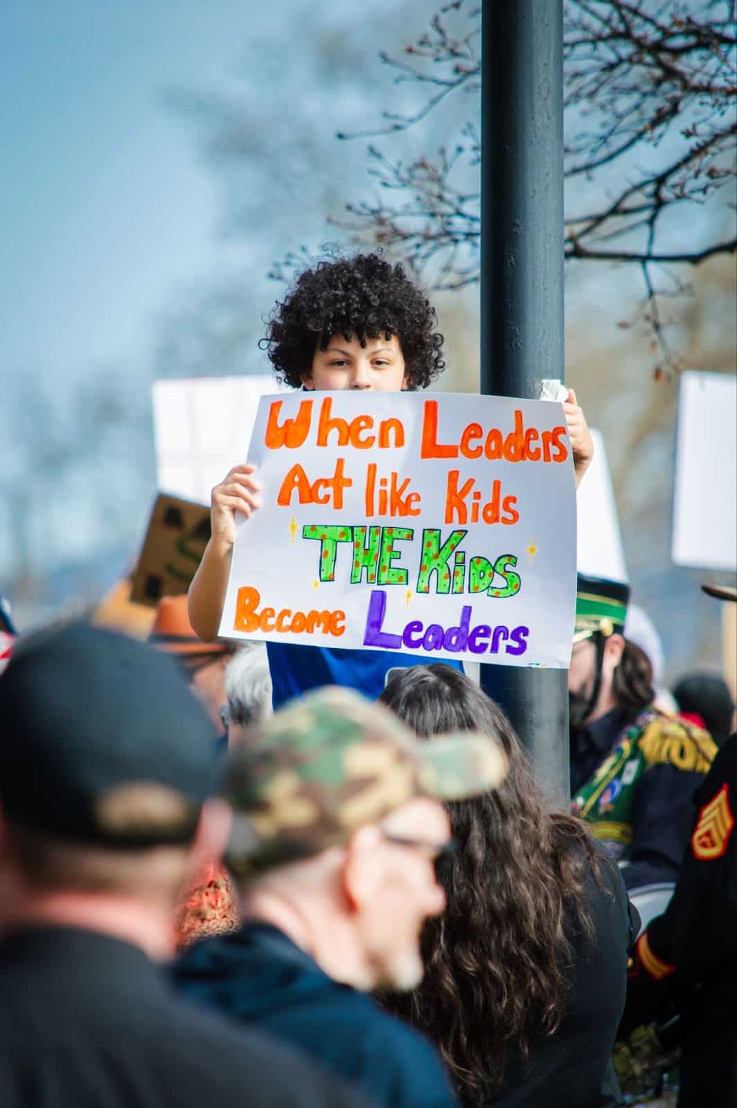 Shooting the intergenerational aspect of the rally produced Rivera’s favorite photo of the afternoon, a picture of a kid hanging on a pole and displaying a sign that read, “When leaders act like kids, the kids become the leaders.”
