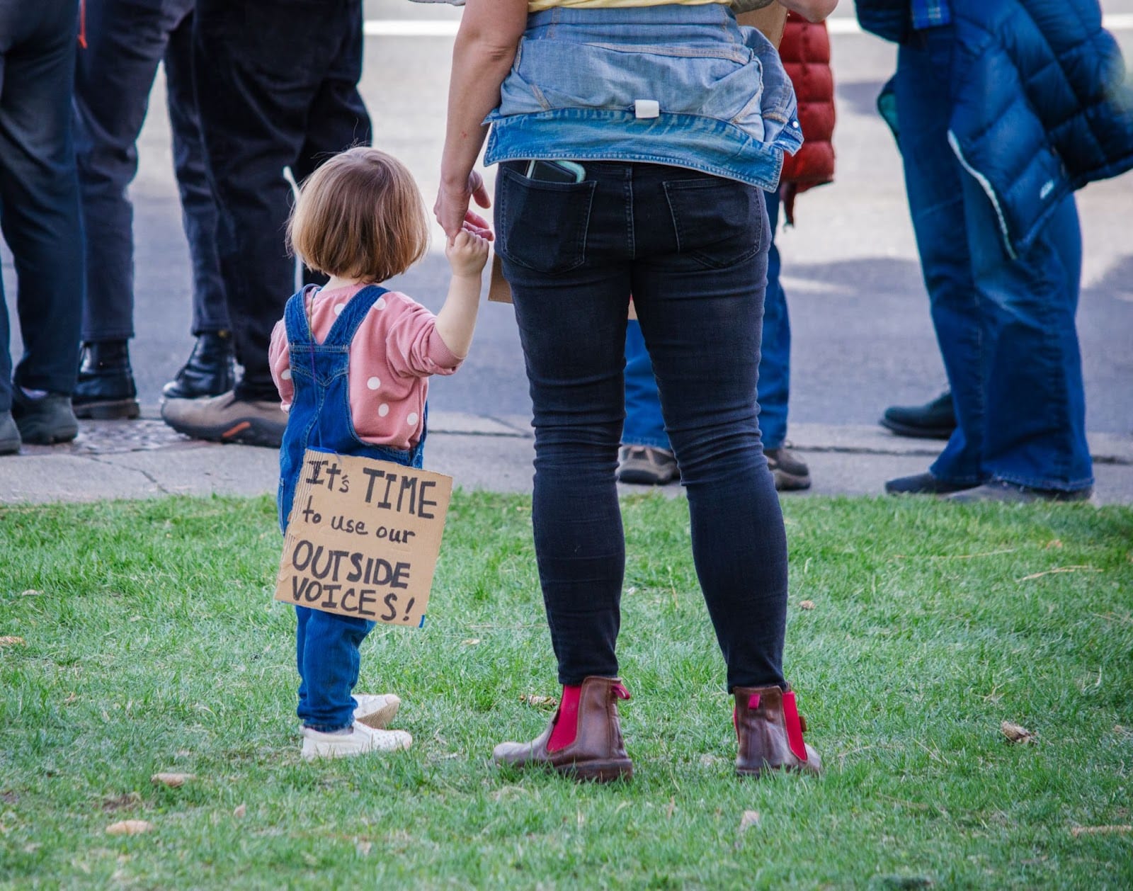 Shooting the intergenerational aspect of the rally produced Rivera’s favorite photo of the afternoon, a picture of a kid hanging on a pole and displaying a sign that read, “When leaders act like kids, the kids become the leaders.”