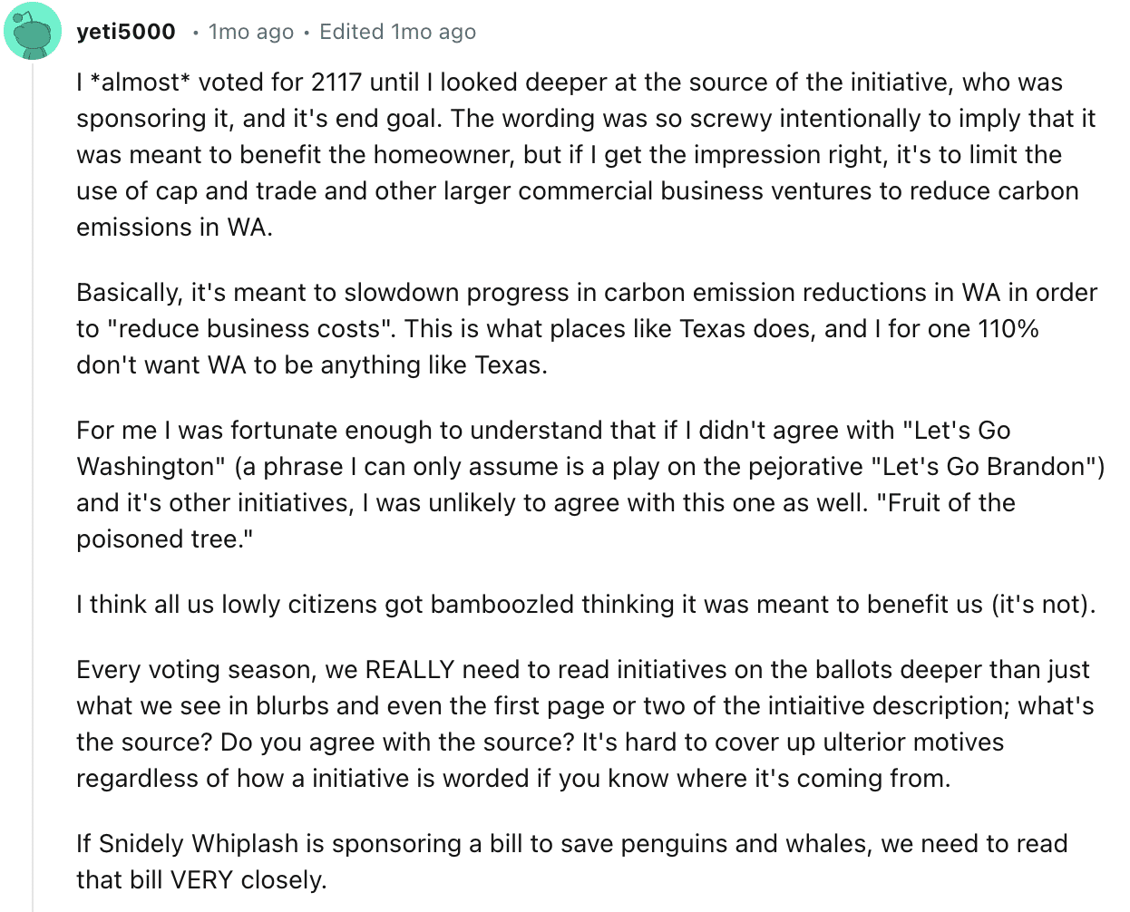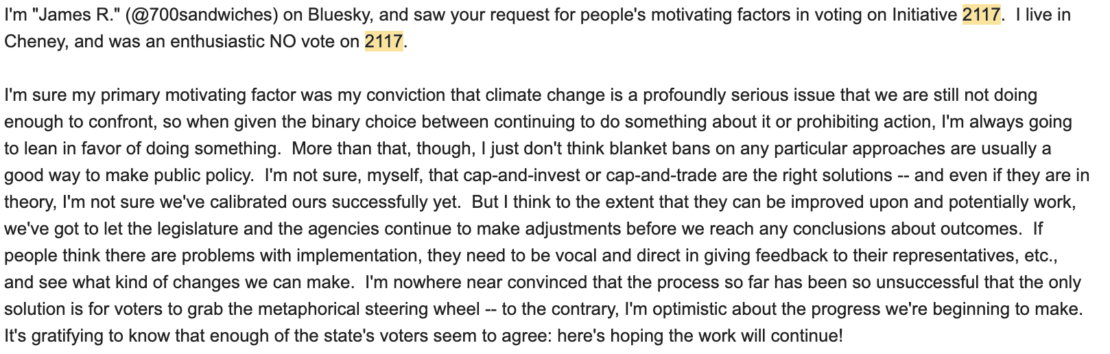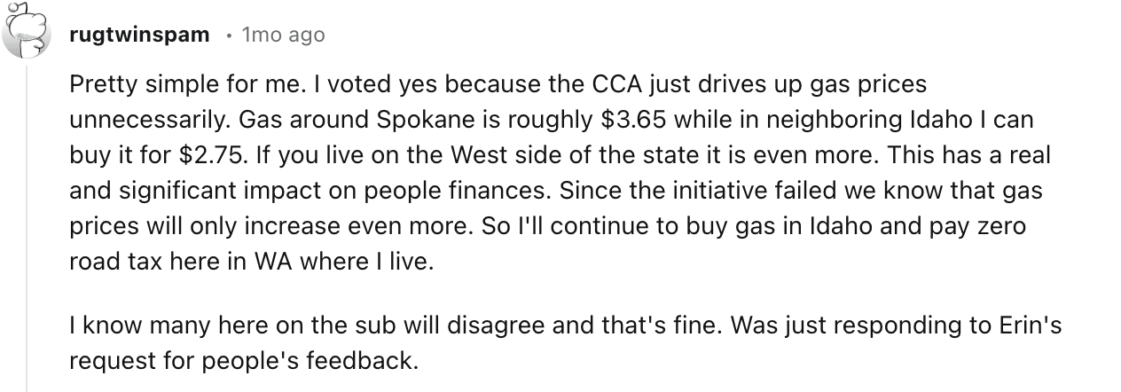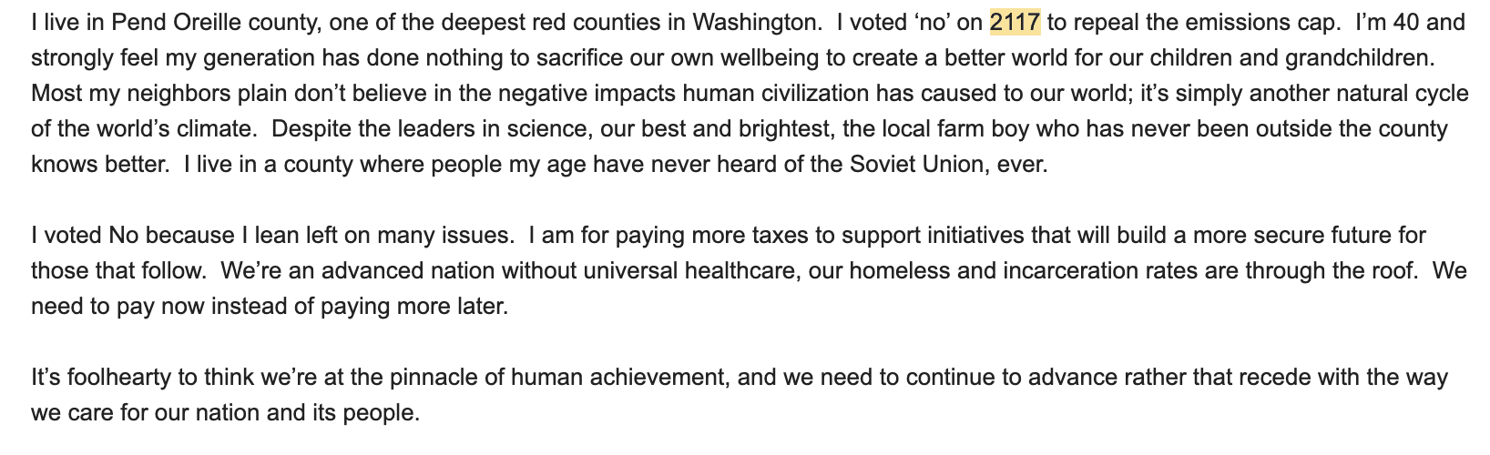 "I voted against Initiative 2117 because the last thing we need in 2024 is decreased funding for transportation,” wrote northwest Spokane resident and transit advocate Sarah Rose in a message to RANGE. “Change is uncomfortable, especially when it requires doing hard things, like re-thinking how people move throughout a city and state … I think of carbon taxes a lot like eating our vegetables, it's not something we necessarily want to do right now, but if we don't we will certainly suffer greater consequences later.”