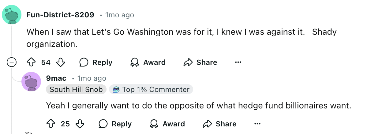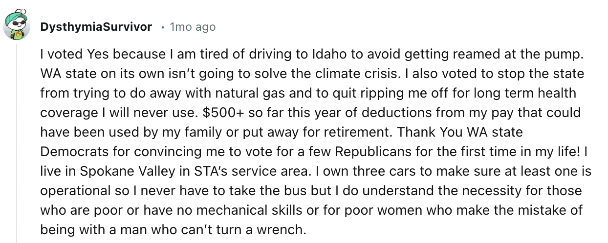 The random sampling of social media users we polled largely didn’t mention transit as a factor in their vote (although when we asked follow-up questions, some of the voters were transit riders). When we asked local urbanists and transit advocates, though, the funding for local transportation and clean energy played a much more front-of-mind role in how they voted.
