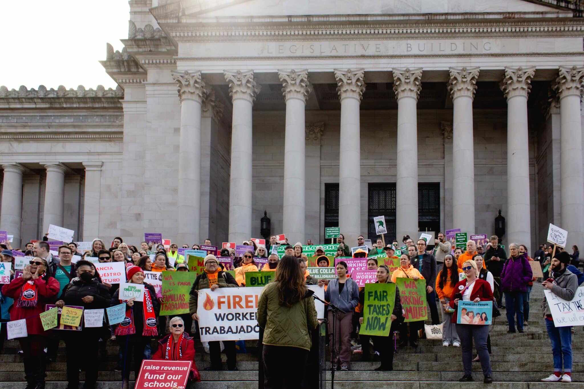 “They feel they were lied to. We have to stop being the ones having the budgets balanced on our backs,” said Mike Yestramski, president of the Washington Federation of State Employees, following a rally Monday at the Capitol held by those pushing the Legislature to tax the wealthy and big businesses to erase the multi-billion dollar deficit.
