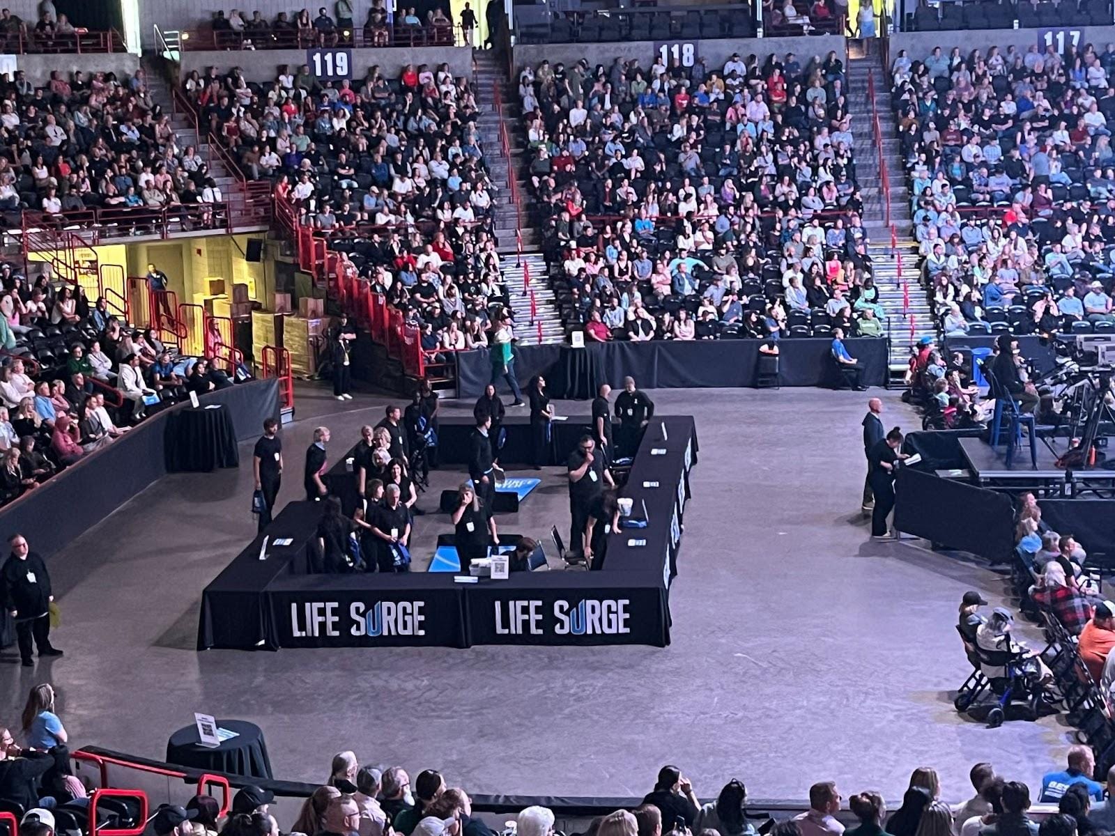 Life Surge would not be able to accommodate everyone who attended the Saturday event, so the pressure to sign up was on: “You need to do it while we're here right now,” said Steve Champa, a stage presenter with Life Surge who introduced the first round of training sign-ups. “The reason is because we've got limited venue size. So in order to take advantage of it, you need to do it right now.”