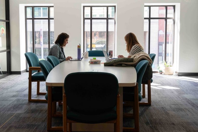 Every morning, students from across Spokane County — at 1,800 square miles, it’s a bit larger than Rhode Island — trek to the Lumen campus downtown. Many take public transit, which is free for youth under 18, and end their rides at a regional bus hub across the street from the school. Once their children reach six months, Lumen students can drop them off at an on-site child care and preschool center, operated by a nonprofit partner, before heading upstairs to start their day. Before then, parents can bring their babies to class.