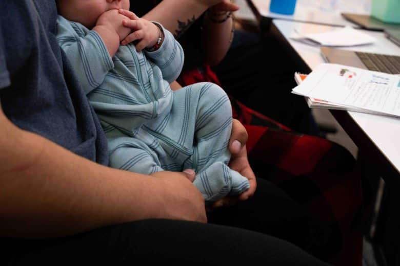 It’s common to see an infant cradled in a teacher’s arm, allowing students to focus on their classwork. On a recent afternoon, two couples traded cradling duties with their newborns during a parenting class on lactation.