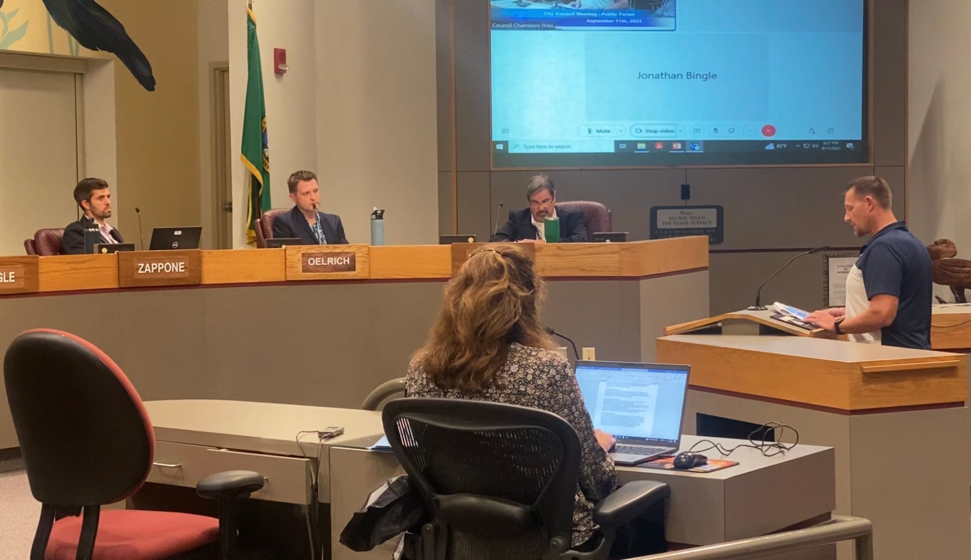 Applington was one of at least eight people who spoke during the council’s open comment period to protest a proposed resolution to censure Mayor Nadine Woodward for her appearance at a Christian nationalist concert, where she accepted a prayer from the fiery local pastor Matt Shea.